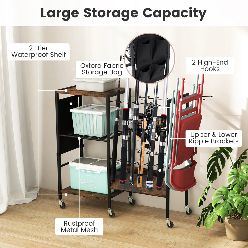 Color: Rustic Brown + Black Material: MDF + Metal Overall Dimension(Without Hook): 84 x 30 x 82 cm (L x W x H) Length of Hook: 20 cm Dimension of Storage Bag: 44 x 26 cm (L x W) Weight Capacity of Each Shelf: 10 kg Weight Capacity of Each Hook: 5 kg Weight Capacity of Storage Bag: 5 kg Net Weight: 7 kg Package Includes: 1 x Fishing Rod Holder 1 x User Guide