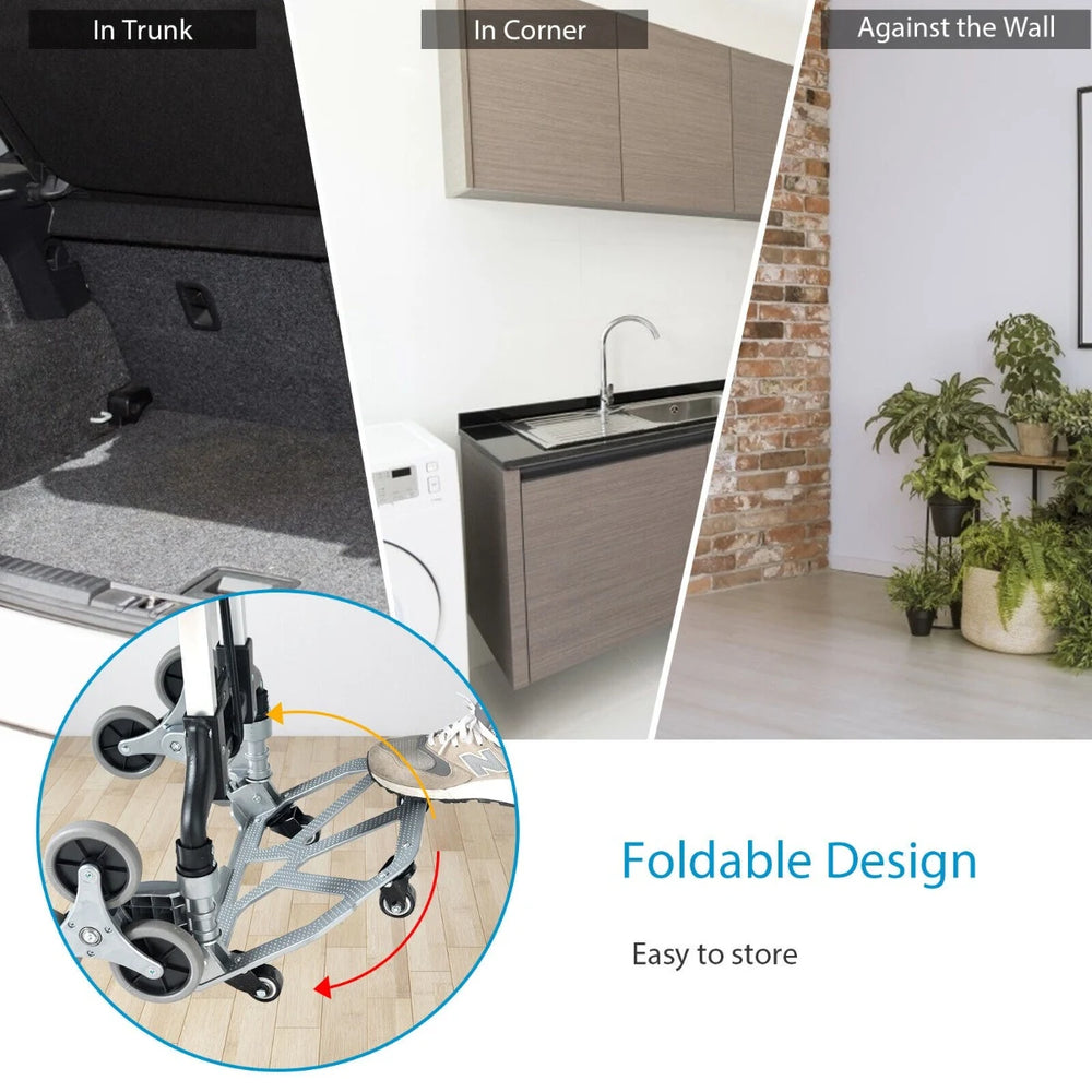 The trolley features a six-wheel climbing system and four swivel universal wheels for smooth rolling on flat surfaces. A 3-position telescoping handle adjusts to suit different users and situations, and the platform folds flat for compact storage when not in use.