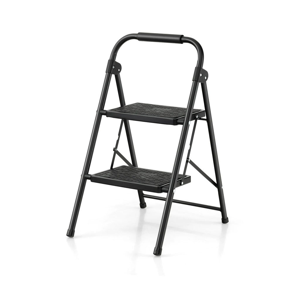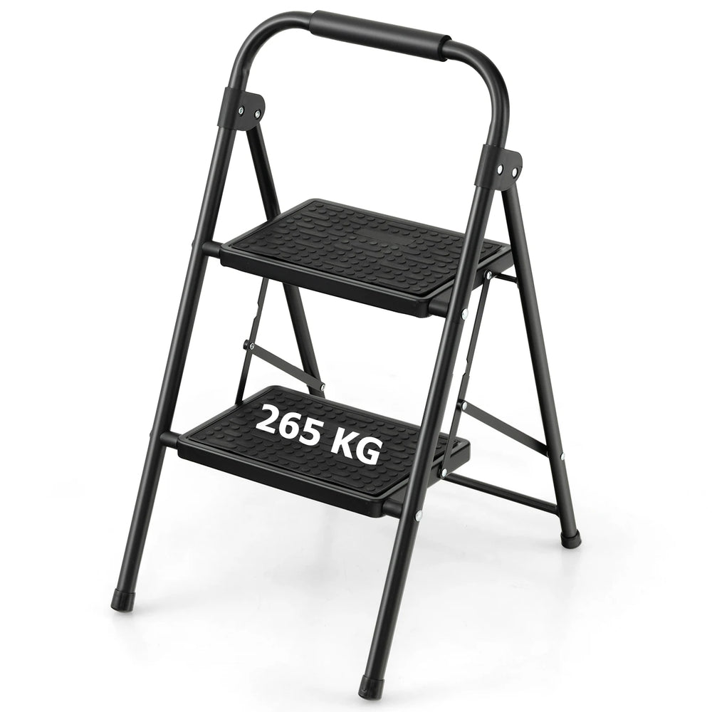 Ou folding step ladder is an essential tool to add convenience o your life! This folding 2-step ladder comes with extra-wide, non-slip steps to ensure you stand stably on them. In addition, the comfortable padded handgrip will provide you with secure support to prevent you from accidentally falling. Made of heavy-duty metal, the 2-step ladder provides a stable standing area that can hold up to 265kg of weight. Besides, there is a secure locking system under the top step for easy folding of the ladder and ensuring the ladder will not shift when in use. Thanks to the folding design, you can easily store it in a corner when you don't need to use it. And this lightweight ladder is easy to move, you can effortlessly move it to the kitchen, living room, or office. With this handy stool ladder, your household chores and work will be less of a hassle. Bullet Point: 2-step Ladder Dimension: Step ladder open size: 47 x 39 x 70 cm (L x W x H), folded size: 39 x 6 x 75.5cm (L x W x H). And the folding ladder is ready to use without any installation. Safe & Stable Construction: Made of sprayed heavy-duty metal, this climbing ladder is high-strength, rust-proof, and resistant to deformation. And extra thickened support bars on both sides provide strong support to whole structure. Besides, the metal lock under the top step will ensure that the step will not shift easily. Upgraded Non-Slip Design: The soft padded handle is designed to provide a comfortable grip and large friction to prevent slipping and ensure you a stable climbing experience. In addition, the extra wide PP pedals have a non-slip rough surface that provides great traction and protects you from falling off while working. Folding & Portable Ladder: Featuring a foldable design, you can simply fold the two-step ladder down to a compact size for space-saving storage by loosening the safety lock at the bottom of the top pedal and lifting the back of the top pedal. Weighing 3.5 kg, you can easily move the ladder to wherever you need! Applicable to Multi-scenes: This versatile 2-step ladder lifts you up from the ground, giving you extra height for washing windows, changing light bulbs, painting walls, and reaching for things in high places. It will not only add convenience to your life, but also make it easier and more efficient to get the job done! Features: Safety lock fastens the ladder during use to guarantee secure use Non-slip handrail provide great grip to prevent falling down Wide pedal with non-slip rough surface offer strong traction Thicken support bars reinforced the structure for higher stability Metal frame with rustproof finish provides stronger load-bearing Protective foot cover protect your floor from scratching Solid fixing screws ensure firm connection of the structure Easy to be folded down for convenient storage Good helper for wall painting, window washing an light changing Super lightweight design makes it portable Assembly-free design greatly saves your time Specifications: Colour: Black Material: Metal, PP Overall Dimension:47 x 39 x 70 cm (L x W x H) Step Size:30 x 20 cm (L x W x H) Folding Size: 39 x 6 x 75.5cm (L x W x H) Net Weight: 3.5 kg Maximum Weight Each:265 kg Package Includes: 1 x 2 Step Ladder 1 x Instruction