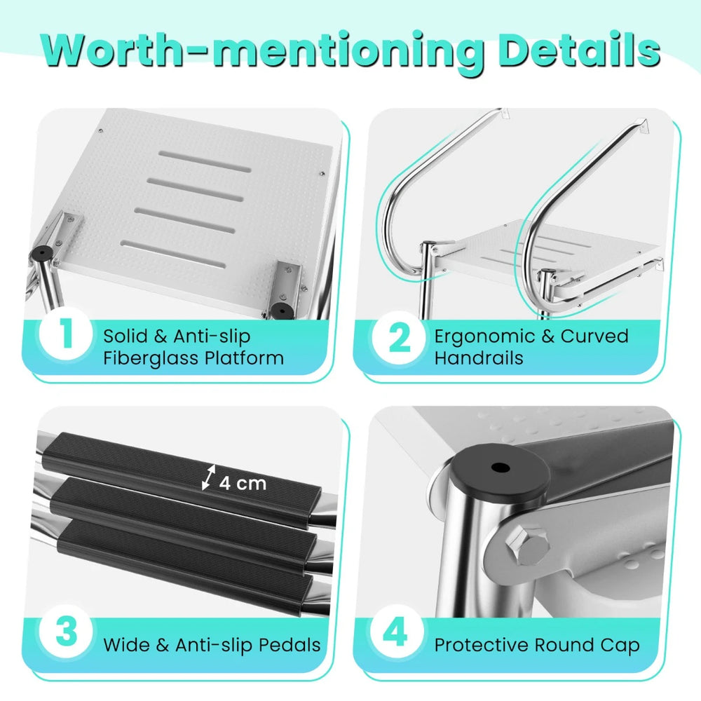 Color: Sliver Material: 304 Stainless Steel, PVC, Fiberglass Product Dimension: 14.5" x 34" (L x W) Folded Size: 20" x 18" x 15" (L x W x H) Ladder Length: 15"-34" Platform Size: 18" x 14" (L x W) Step Size: 7" x 1.5" (L x W) Distance Between Steps: 10.5" Net Weight: 14.5 lbs Maximum Capacity: 500 lbs Package Includes: 1 x Folding Boat Ladder 1 x Accessory Kit 1 x Instruction