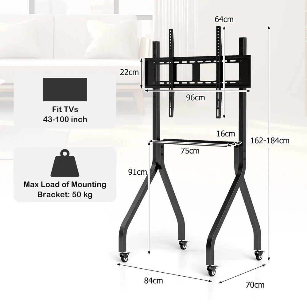 Colour: Black Material: MDF, Metal Overall Dimensions: 66 x 40 x 97-113 cm (L x W x H) Dimensions of Base: 55 x 40 cm (L x W) Compatible VESA Patterns: Min: 100 x 100 mm, Max: 600 x 400 mm Mounting Capacity: 50 kg Net Weight: 11 kg Box Qty: 1(May vary by batch) Package Includes: 1 x TV Stand 1 x Instruction Manual