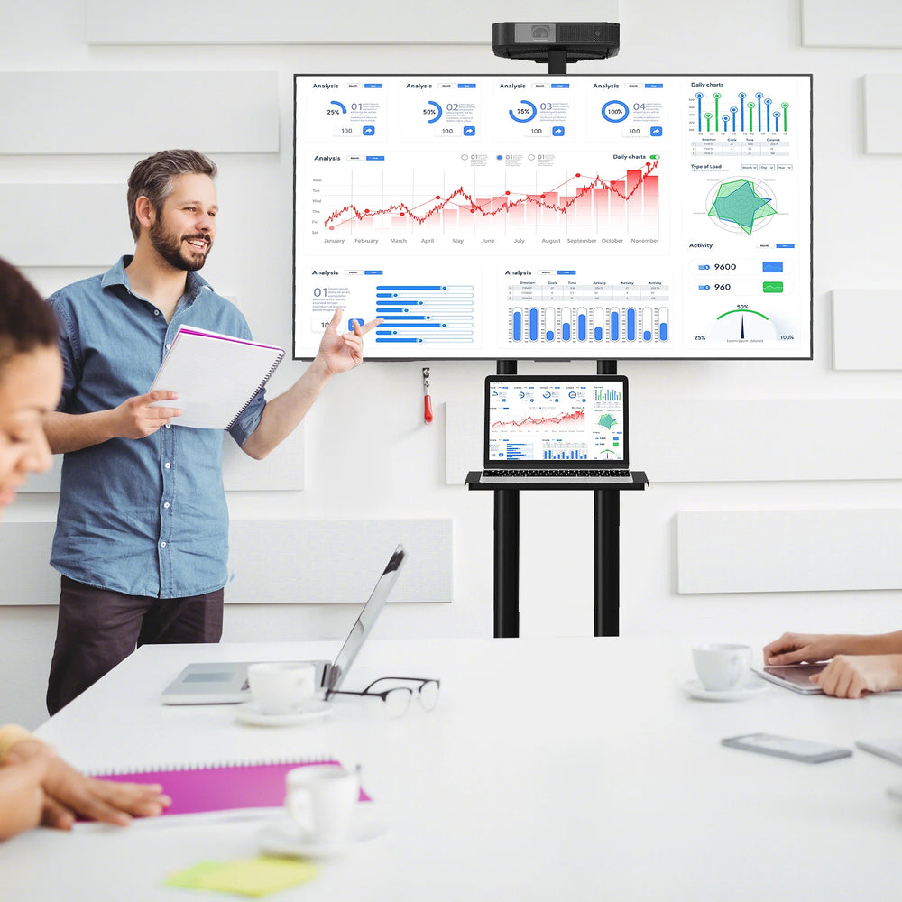 Color: Black Material: Metal Overall Dimensions: 78 x 78 x 150-188 cm (L x W x H) Dimensions of Top projector Shelf: 20 x 12 cm (L x W) Dimensions of AV Shelf: 34 x 20 cm (L x W) Height of AV Shelf from Bottom: 67 cm Width of Sliding Bracket: 42 cm Compatible VESA Size: 100 x 100-600 x 400 mm Adjustable TV Bracket Height: 116-150 cm Hole Spacing: 5 cm Max Load of Mounting Bracket: 50 kg Max Load of Projector Shelf: 2 kg Max Load of AV Shelf: 5 kg Net Weight: 16 kg Package includes: 1 x Mobile TV Stand 1 x User Guide