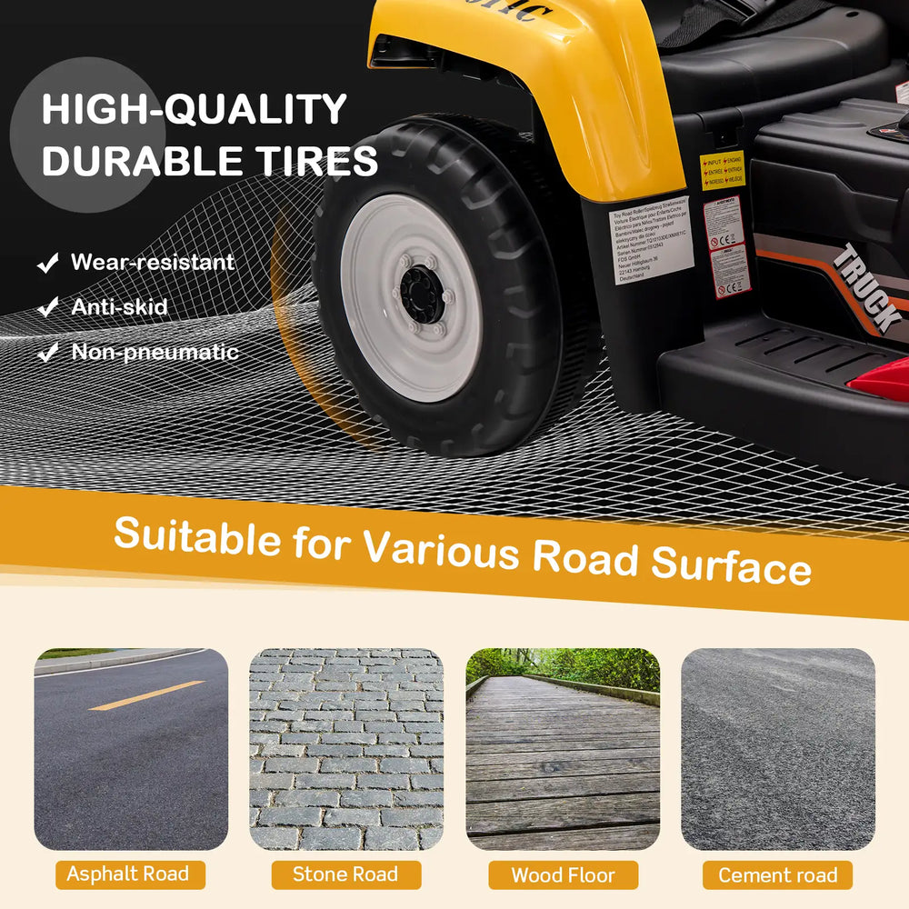 This kids' ride-on excavator is a perfect gift for both boys and girls. The forward/ backward lever, flexible steering wheel and foot pedal ensure kids' easy operation. Kids can control the bucket handle to adjust the height and angle of the bucket. It's also equipped with extra remote control for parents to control the car. Besides, it features a headlight, horn, USB, and wireless connection for more joy. Anti-slip and wear-resistant wheels help kids to ride smoothly on brick roads, cement roads, wood floors, and asphalt roads. Its slow start function makes it even safer to drive. What's more, it also possesses a wide seat, safe backrest, and comfortable footrests. In addition, ASTM and CPSIA certifications make it safe for kids to use. Premium materials ensure long-lasting service life. Bullet Point: Realistic Digging Experience: Featuring adjustable arms and buckets, kids can freely control the bucket's height and angle with the help of a bucket handle. Thus, it enables kids to pretend to dig to acquire role-playing fun. Tips: The shovel is only for decoration, and loading is not allowed. Manual Operation and Remote Control: Kids can use the operation lever to move forward/backwards, the steering wheel to change its direction, and the foot pedal to accelerate. On the other hand, this kids' ride-on excavator is also designed with remote control for parents to control this vehicle(requires 2 AAA batteries, not included). Multiple Entertainment Functions: This vehicle possesses multiple functions for a fun driving experience, including LED headlights, horns, and wireless connection. Besides, the music panel also has a USB port to connect external devices for much more music, making kids' riding process more enjoyable. Safe and Comfortable Driving: Slow start function allows the car to start safely and steadily. 4 wide wheels are durable, anti-slip, and wear-resistant, allowing you to smoothly ride on brick roads, cement roads, wood floors, asphalt roads,s and more. Apart from that, the comfortable seat with a safety belt and wide footrests offers more safe protection. It also has passed ASTM and CPSIA certifications. Perfect Gift for Your Toddlers: This vehicle is an ideal birthday or holiday gift for 3-8 years old kids. Beautiful colours and realistic excavator outlook attract kids' attention at first sight. In addition, made of safe and durable materials, this digicam to accompany your little one for years.
