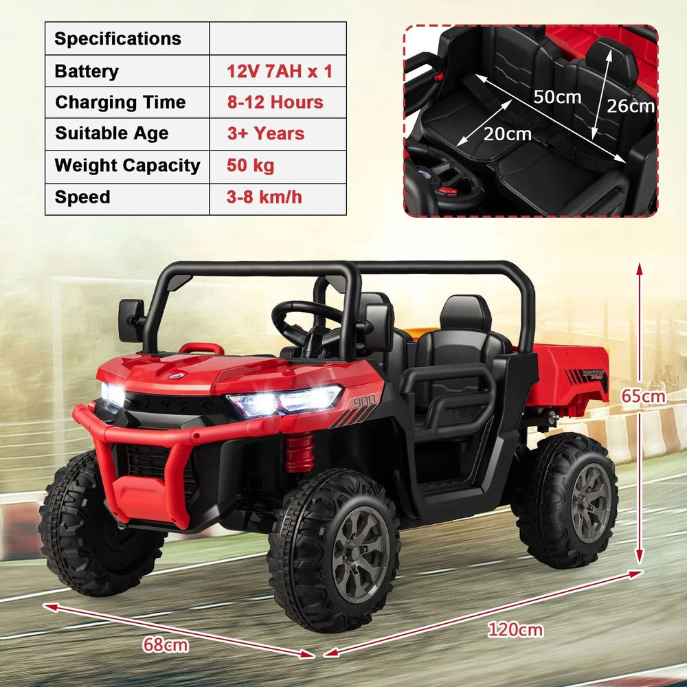 Featuring realistic tractor appearance, bright LED headlights and rearview mirrors, the ride on truck offers a realistic driving experience for kids. Your children just need to press the power switch, push the shift lever and step in the foot pedal, easily make the car move forward, backward or stop. The automatic dumping and lifting gear box with openable tailgate and shovel is surely to attract kids attention. Besides, the off-road UTV is equipped with cheerful music and horn sound, which provides unlimited fun during driving. And the USB, MP3 and phone connection function also make it available to more entertainment resources. Moreover, parents can rest assured that this 12V battery powered dump truck is very safe and reliable. The spring suspension system effectively absorbs the shock and minimizes the impact, offering a smooth ride. The seat is also attached with a safety belt to provide enhanced protection. Even better, the soft start and stop technology effectively prevents kids from turning pale with sudden acceleration and brake. Parents can control the ride on UTV freely with the 2.4 G remote control as well. Safety is Priority: This ride on truck, made of PP and heavy-duty steel, is sturdy and durable enough to accompany your kids through their childhood. What's more, spacious seat with adjustable safety belt, lockable doors and soft start technology are designed to protect kids from potential dangers. Automatic Dump Bed and Shovel: There is a tiltable dump bed which will dump or lift automatically by pushing the dump bed switch. In addition, together with the shovel, your little ones can enjoy hours of fun to load sand, collect fallen leaves, carry items and more. Two Driving Modes: Equipped with a 2.4G remote control, parents can easily control their children's driving on the tractor and enhance their interaction with their children. On the other hand, one-start button, forward/stop/reverse lever and foot pedal offer your little ones realistic driving experience. 2 Seats with Infinite Fun: The electric toy car features 2 seats and high load capacity up to 50 kg, which is able to delight 2 little kids at the same time. Besides, built-in music, aux input, USB port and wireless connection functions add a lot of pleasure. And rocking mode brings extra surprise to your children. Powerful Off-Road Performance: 4 extra-large wear-resistant wheels are all fitted with spring suspensions, providing the dump truck with stronger off-road performance on various roads. Meanwhile, dual powerful motors and 12V rechargeable battery ensure better and longer driving fun.