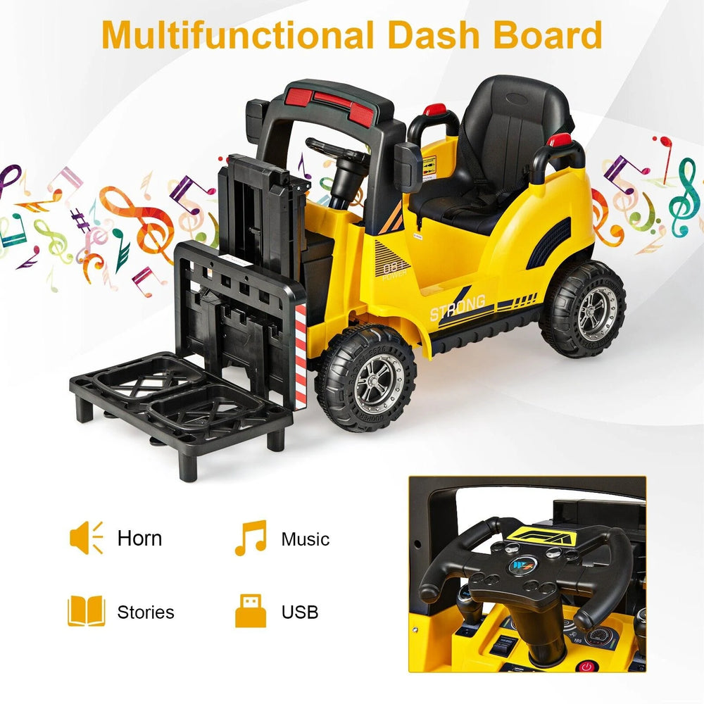This ride-on forklift is specially designed for 3-7 years old toddlers. A realistic arm fork and a detachable lift pallet help kids to lift different items like a real worker. Functional buttons, flexible steering wheel and convenient foot pedal make it easy to operate. Besides, parents can use the remote control to control the vehicle if needed. When your little one is riding, the light, music, horn and story functions can ensure endless fun. To guarantee higher security, we design it with backrest, safety belt and side armrests. Plus, 2-4 km/h speed and 4 durable wheels enable kids to ride with safety. In addition, this car also features spacious seat and comfortable footrest. Let your little ones to start their adventure!!! Funny Lift Pallet with Handle: This kids forklift car is designed with a realistic arm fork and a detachable lift pallet, allowing children to better understand worker's job. Kids can use the left regulating handle to lift and lower from 6.5cm to 31cm, which helps kids to move or store their stuff conveniently. Multifunctional Dash Board: The dash board features various interesting functions, including light, music, horn and story. Apart from that, the USB port and MP3 player can be used to connect different devices to offer more music options, bringing kids hours of fun. 2 Modes Operation: This electric vehicle car can be operated in 2 methods: kid's manual control or parent remote control. Kids can press the functional buttons to move, step on the foot pedal to accelerate and rotate the steering wheel to change direction. Besides, the remote control allows parents to conveniently operate (requires 2*AA batteries). Powerful Motors and Non-slip Wheels: 2 powerful motors(12V) and 1 12V built-in battery ensure a safe speed of 2-4 km/h. Plus, thanks to the non-slip wheels, this ride on trunk enables kids to smoothly ride on different road conditions, such as wood floors, brick roads, cement roads or asphalt roads. Ideal Gift for Your Little One: This battery powered forklift is a perfect gift, which can exercise kids' motor skills and hand-feet coordination. In addition, safe backrest avoids kid's leaning back, safety belt firmly fixes kids into the seat, also wide seat and footrest area allow kids to feel comfortable during their riding process.