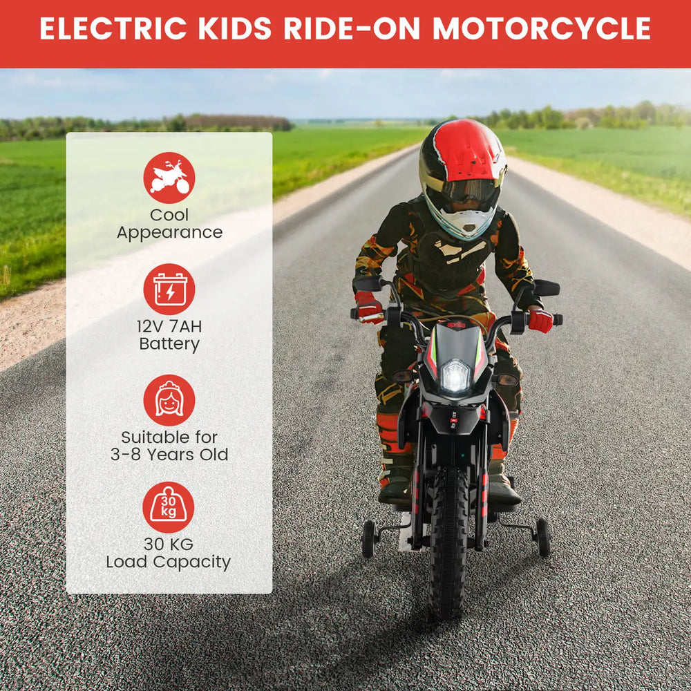 Colour: Black/ Red Material: PP + Metal Overall Dimension:106.5 cm x 56 cm x 80 cm (L x W x H) Seat Size:34 cm x 15 cm(L x W) Suitable Age: 3-8 Years Old Load Capacity: 30 kg Speed: 5.5-6 km/h Battery: 12V 7AH Charger: 12V 0.9A Play Time: 1-2 Hours Charging Time: 8-12 Hours Net Weight:11.5 kg Package includes: 1 x Aprilia Licensed Kid's Ride-On Motorcycle 1 x Charger 1 x Instruction Manual