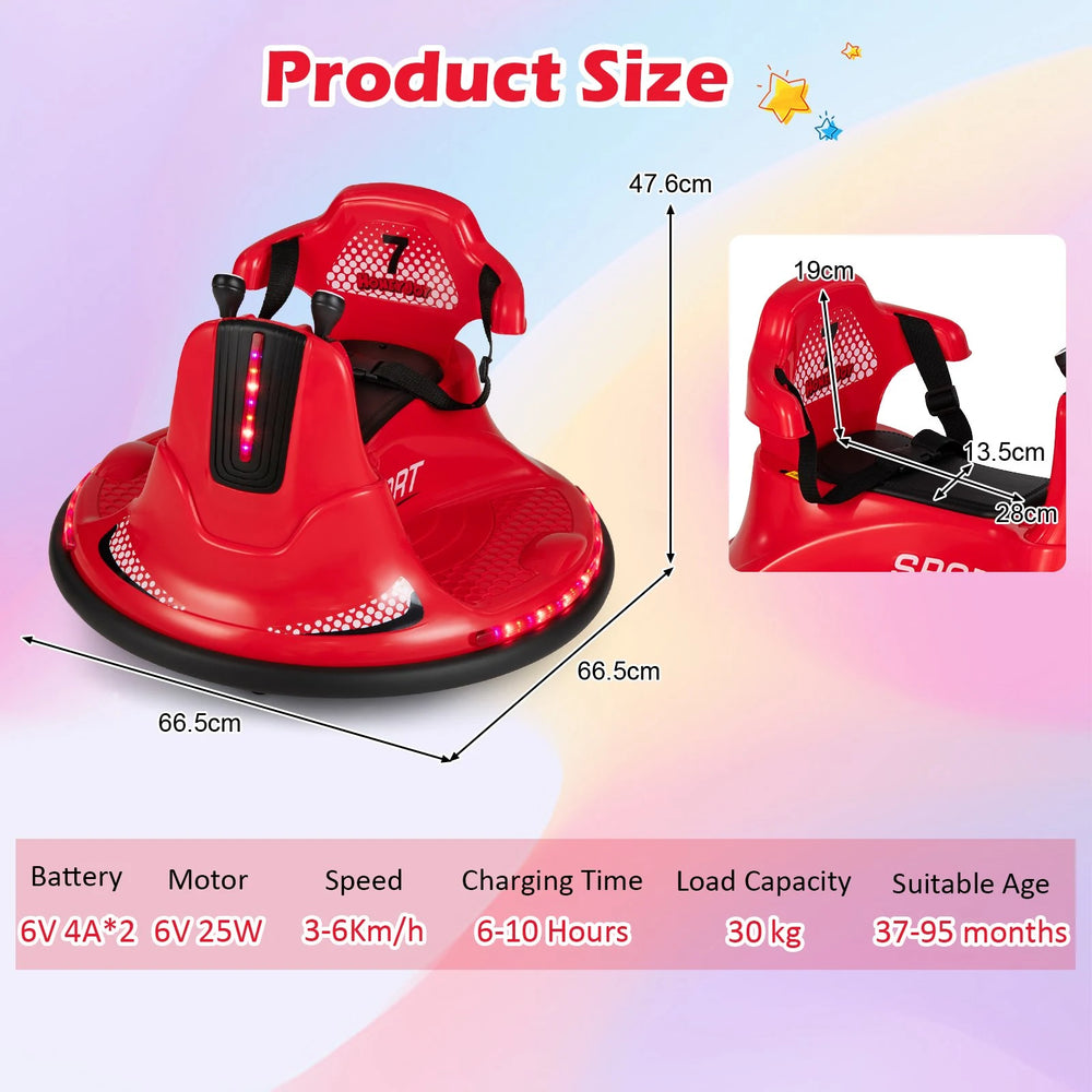 Colour: Blue/ Pink/ Red/Purple Material: PP, NBR Overall Dimension: 66.5 cm x 66.5 cm x 47.6 cm (L x W x H) Seat Size: 28 cm x 13.5 cm(L x W) Backrest Height: 19 cm Battery: 6V 4AH*2 Motor: 6V 25W Suitable Age: 37-95 Months Charging Time: 6-10 Hours Speed: 3-6 km/h Max Load Capacity: 30 kg Gross Weight: 8 kg Net Weight: 6 kg Package includes: 1 x Electric Bumper Car 1 x Remote Control 1 x Charger 1 x User Manual