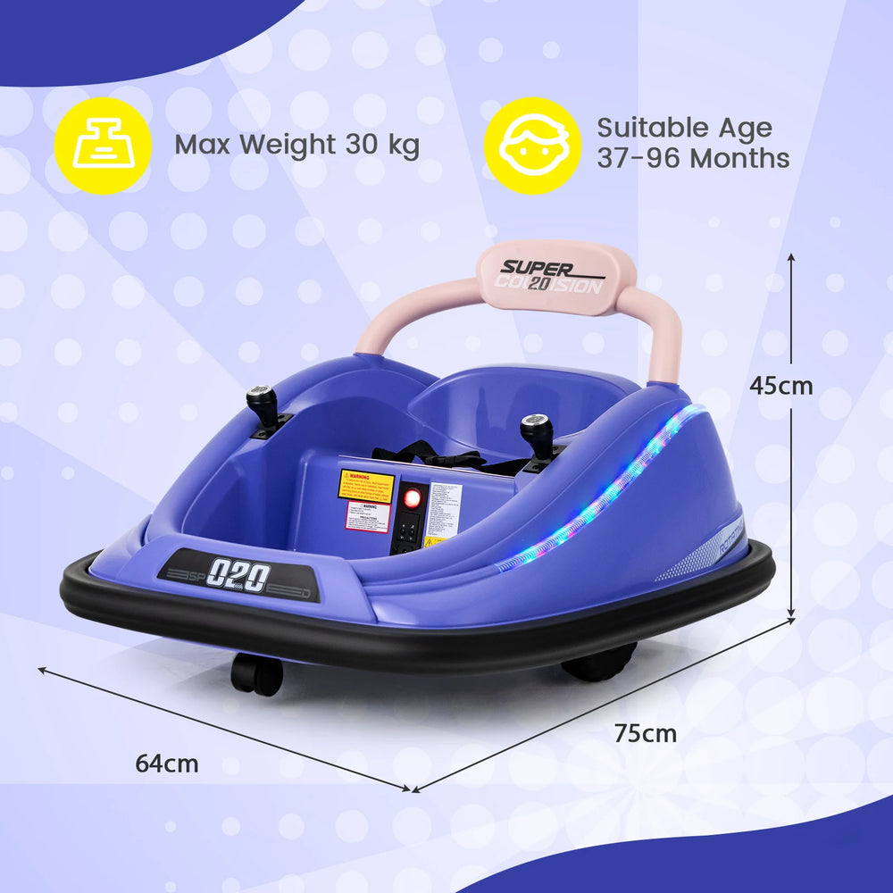 Colour: Black/Blue Material: PP Overall Dimension: 76 x 64 x 45 cm (L x W x H) Max Remote Distance: 30 m Max Load Capacity: 30 kg Suitable Age: 37-96 Months Speed: 3 km/h Charger: 12V 500mA Battery: 12V 4.5AH Charging Time: 8-12 Hours Net Weight: 8 kg Box Qty:1(May vary by batch)Package Includes: 1 x Kids Bumper Car 1 x Charger 1 x Remote Control 1 x Instruction Manual