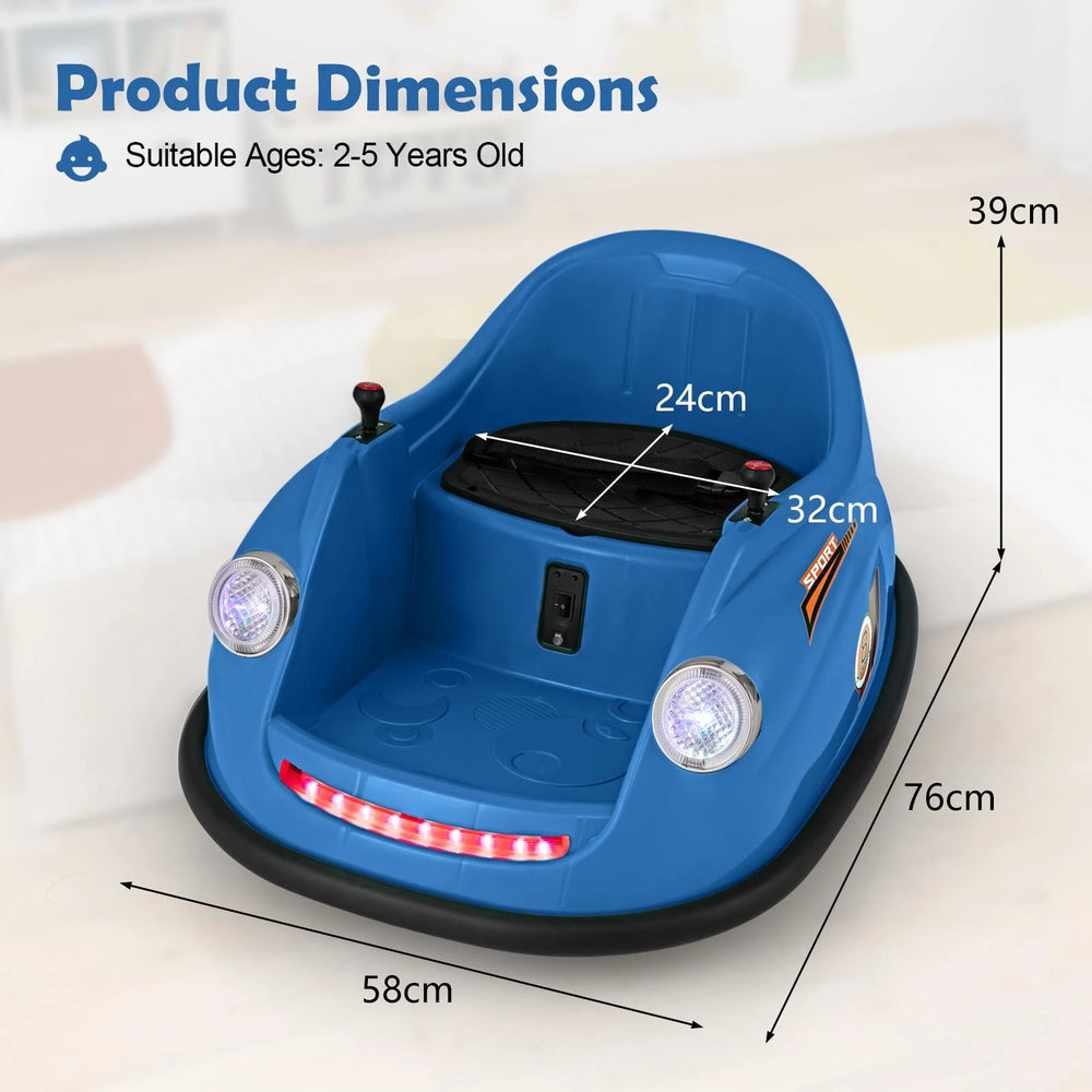 Colour: Blue/Navy/Pink/Red Materials: PP, Metal Product Dimensions: 76 x 58 x 39 cm (L x W x H) Size of Seat: 32 x 24 cm (L x W) Speed: 1.5 km/h Net Weight: 6 kg Weight Capacity: 20 kg Suitable Age: 2-5 Years Old Motor: 12V x 2 Battery: 12V 4.5AH Charger Input: AC120V 0.25A 60Hz Charging Time: 8-12 Hours Battery Type of Remote Controller: 2 x AAA Batteries (Not Included) Package Includes: 1 x Ride on Bumper Car 1 x Remote 1 x Charger 1 x Instruction