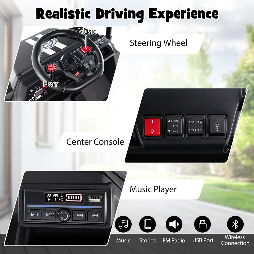Fitted with a 24V 7AH battery and 4 75W motors, this 2-seater ride on truck delivers an exciting driving experience for kids. The detachable awning provides shade from the sun, allowing children to enjoy each ride. Kids can control the vehicle using the steering wheel and foot pedal, or parents can take over with the remote control. Additionally, the 4 wheels with metal spring shock absorbers ensure a smooth and stable ride on different roads. The built-in LED lights, music, stories, and FM radio offers endless entertainment, while the USB port and wireless connection enhance fun. With a spacious dump bed, children can easily carry their belongings during their adventures. This ride on golf cart is suitable for 2 kids above 3 years old, with 2 individual seats including safety belts for comfort and security. If you are looking for such a product, do not hesitate to buy it! 4WD Battery Powered Car: This 2 seater ride on car for kids is powered by a 24V 7AH rechargeable battery and driven by 4 75W powerful motors, allowing for forward, backward, left, and right movement at 1.9-4 mph adjustable speed. With a hidden charging port, recharging is convenient and safe. 2 Modes & Detachable Awning: With 2 speed settings, the 24V electric car for kids is simple for little drivers to operate using the steering wheel and foot pedal. Alternatively, parents can use the remote to control with 3 variable speeds. Moreover, the ride on toy boasts a removable awning that is able to shield from the sun. Smooth & Secure Driving: The battery powered electric truck boasts 4 wear-resistant wheels, each with a metal spring shock absorber. Together with the soft start function, this ride on golf cart ensures a comfortable and secure ride on various terrains, such as the brick road, wooden floor, rubber road, and asphalt road. Unlimited Entertainment: Featuring bright LED lights, music, stories, and FM radio, the 2 seater kids ride on truck keeps kids engaged and entertained. Additionally, a USB port and wireless connection broaden entertainment choices. The spacious dump bed accommodates childrens favorite toys for added fun. Perfect for Boys & Girls: This ride on dump truck complies with UKCA, which makes it a reliable present for little ones over 3 years old. The wide 2-seater arrangement with safety belts, providing your child with an enjoyable and realistic driving experience.