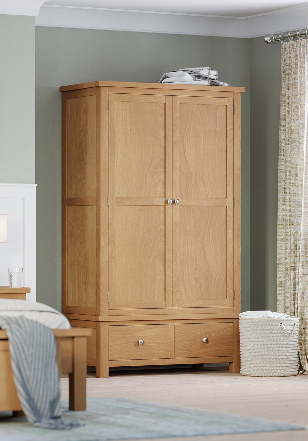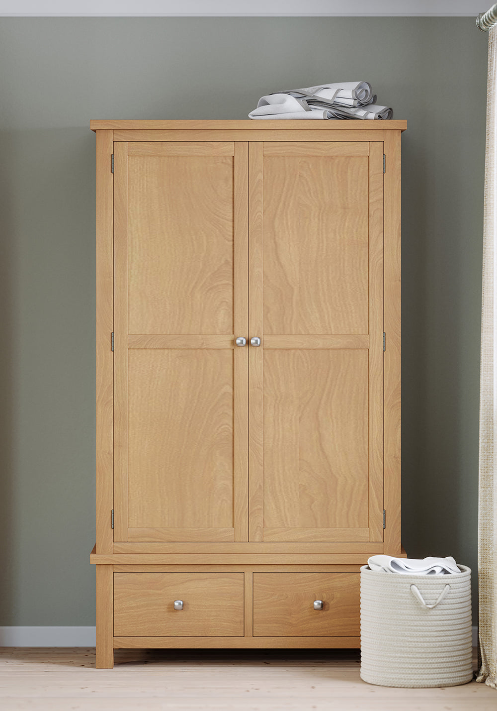 The Wessex Oak Double Wardrobe combines classic oak character with contemporary, clean lines for practical bedroom storage. It is crafted using oak with supporting pine and MDF components and finished in a protective light lacquer to emphasise the grain while offering surface protection.