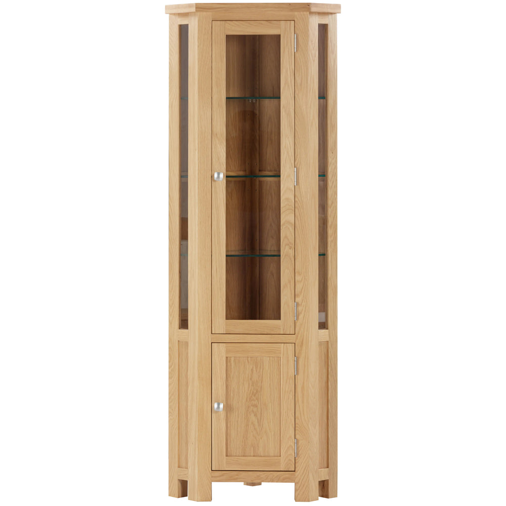 The Wessex Oak Glazed Corner Display Cabinet brings contemporary style to a compact corner footprint. Clean straight lines and stylish panels are finished in a protective light lacquer that accentuates the oak grain while guarding against everyday wear. A single integrated LED display light highlights items displayed on the glazed shelves.
