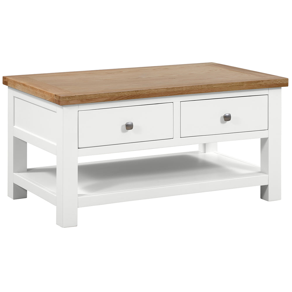 The Wessex coffee table pairs clean, contemporary lines with a natural oak top for a versatile living room centrepiece. It is finished as standard in Ivory (also available in White and Moon Grey) and combines robust engineered components for long-lasting use.