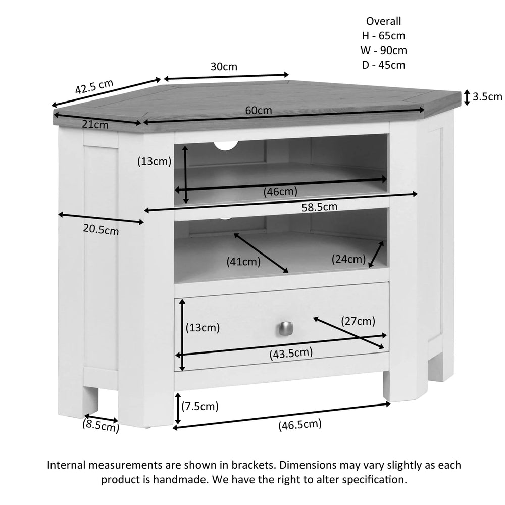 Built from oak, MDF and rubberwood components, the unit combines a painted body with a natural timber top for a mixed-material aesthetic. Practical dovetailed drawers provide reliable storage for remotes, cables and media accessories, while the cabinet's geometry is designed specifically to sit neatly in a corner to maximise floor space.