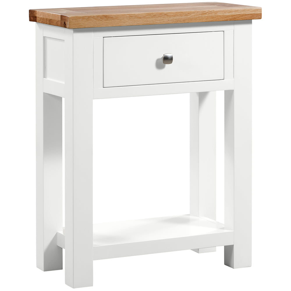 A compact, elegant console table crafted from oak, MDF and rubberwood, the Wessex is designed to sit comfortably in a hallway or behind a sofa. It is finished as standard in Ivory with a natural oak top, and is also available in White and Moon Grey to suit a range of interiors. Clean straight lines and stylish panel details give it a contemporary character.