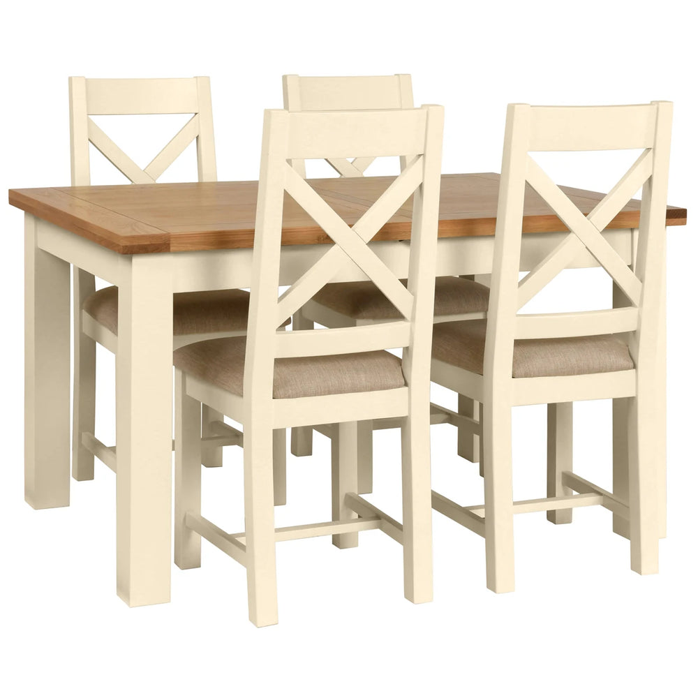 The Wessex Ivory Medium Extending Dining Table combines a crisp ivory finish with natural oak tops for a fresh, contemporary look. Designed for everyday family use, it balances clean lines with practical extending functionality so your dining space adapts to changing needs.