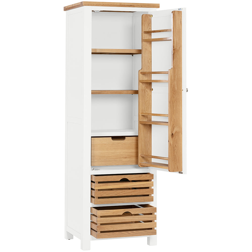 The Wessex Painted Tall Larder Cupboard is a floorstanding single pantry designed for kitchen and utility storage. Finished as standard in Ivory with natural oak tops, this tall cupboard blends clean, contemporary lines with traditional panel detailing to suit a range of interiors.