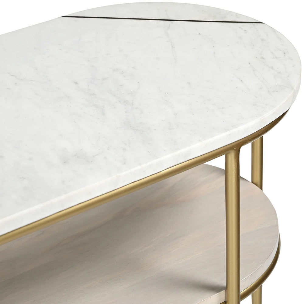 The Haven console table blends natural materials and precise detailing to bring a modern statement to hallways and living rooms. A polished white marble top features an intricate brass inlay for a refined focal point, while the pale-washed solid acacia adds warmth and subtle colour contrast.