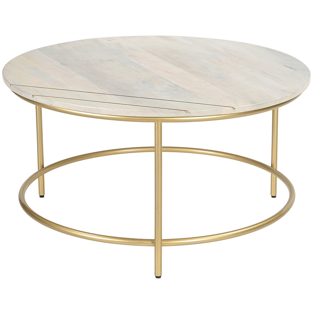 The Haven Pale Acacia coffee table pairs a solid, pale-lacquered acacia top with delicate brass inlay to create a striking focal point for contemporary living rooms. Its 87 cm round top offers generous surface area for drinks and décor while keeping a light, airy presence thanks to the pale washed finish.