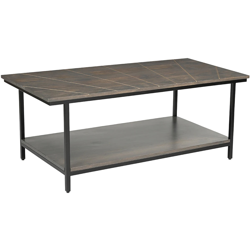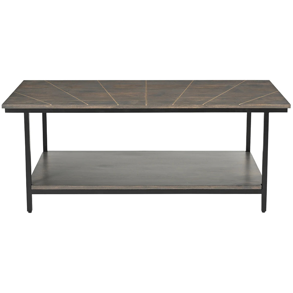 The Haven coffee table is crafted from solid mango wood with an elegant dark brown lacquer finish that highlights the grain. The top is set with intricate brass inlays, creating a refined focal point suitable for contemporary living spaces.