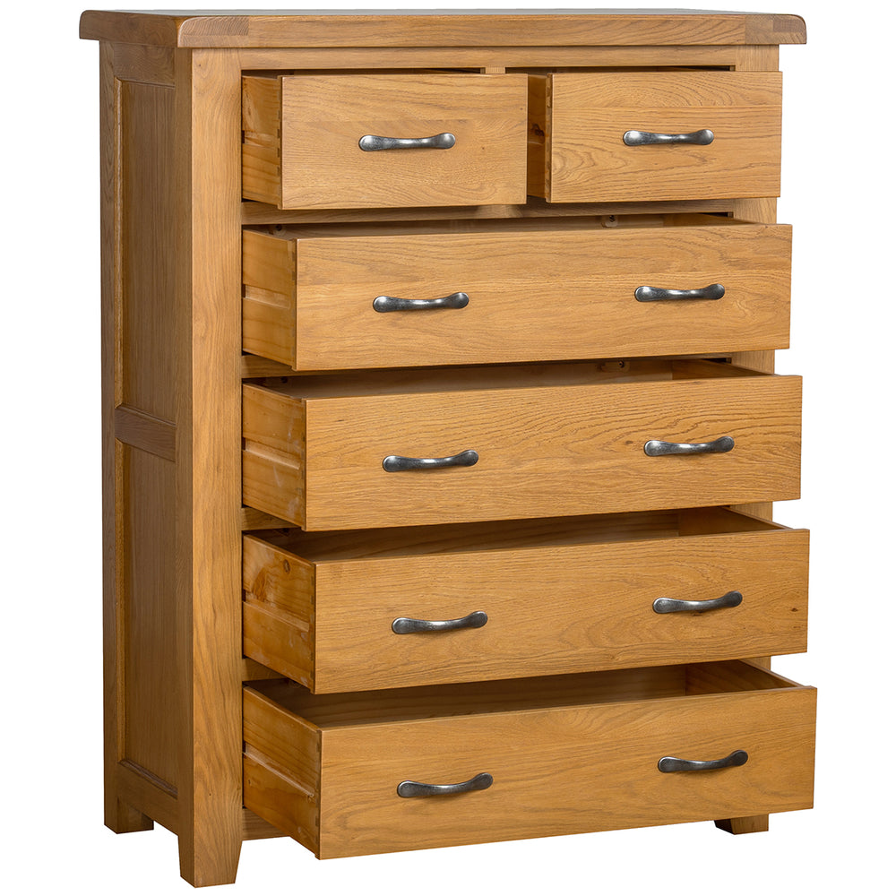 This sizeable chest works well as a focal storage piece in bedrooms or dressing areas where robust capacity and a rustic look are required. The balanced mix of solid timber top and engineered components keeps the price competitive without sacrificing the oak character and drawer performance.