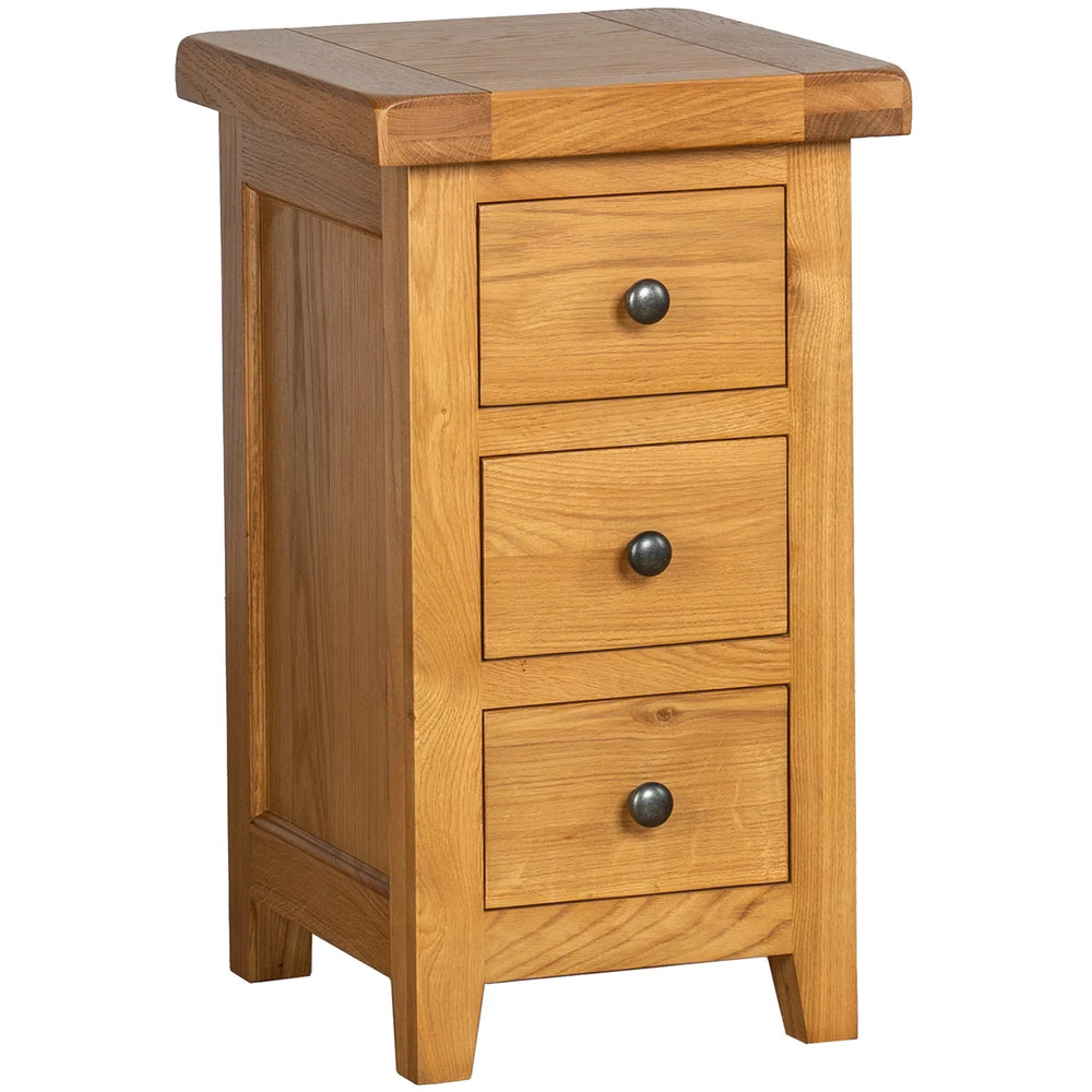 The Quantock Oak Compact 3-Drawer Bedside is a narrow bedside table that pairs traditional styling with modern rustic details. Its chunky white oak top has softened corners for a gentler profile, and the tapered legs lift the piece to maintain a light, airy silhouette in smaller bedrooms.