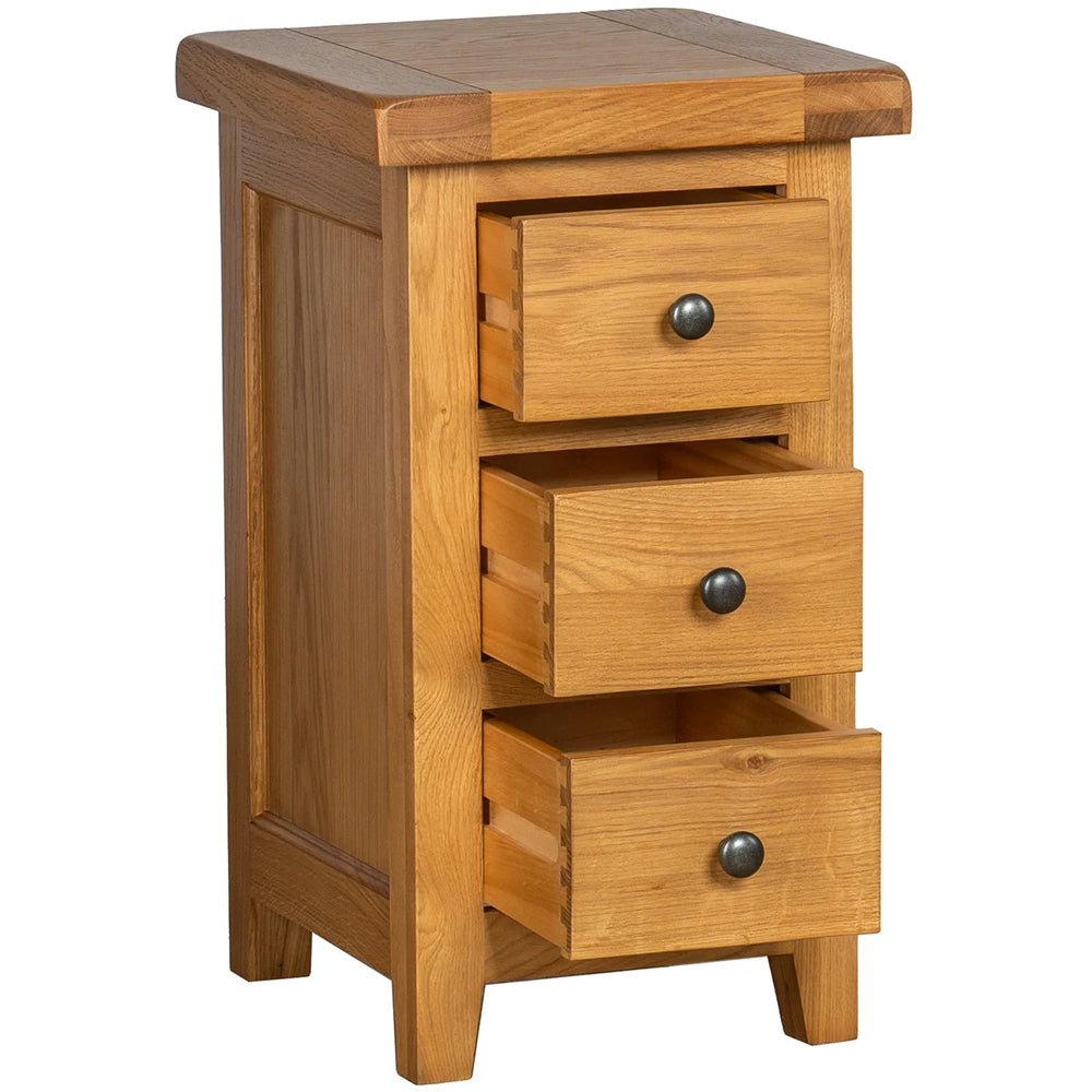 Three dovetailed drawers give reliable storage for nightly essentials while the contemporary metal rustic pull handles add an industrial touch. The case combines oak, pine and MDF to balance solid wood character with practical construction for everyday use.