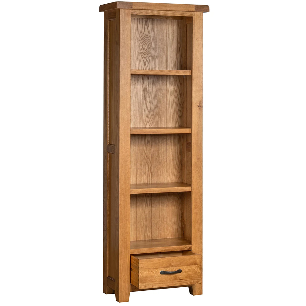 Quantock Slim Rustic Oak Bookcase with Chunky White Oak Top, Dovetailed Drawers and Tapered Legs — 60 x 180 x 32 cm