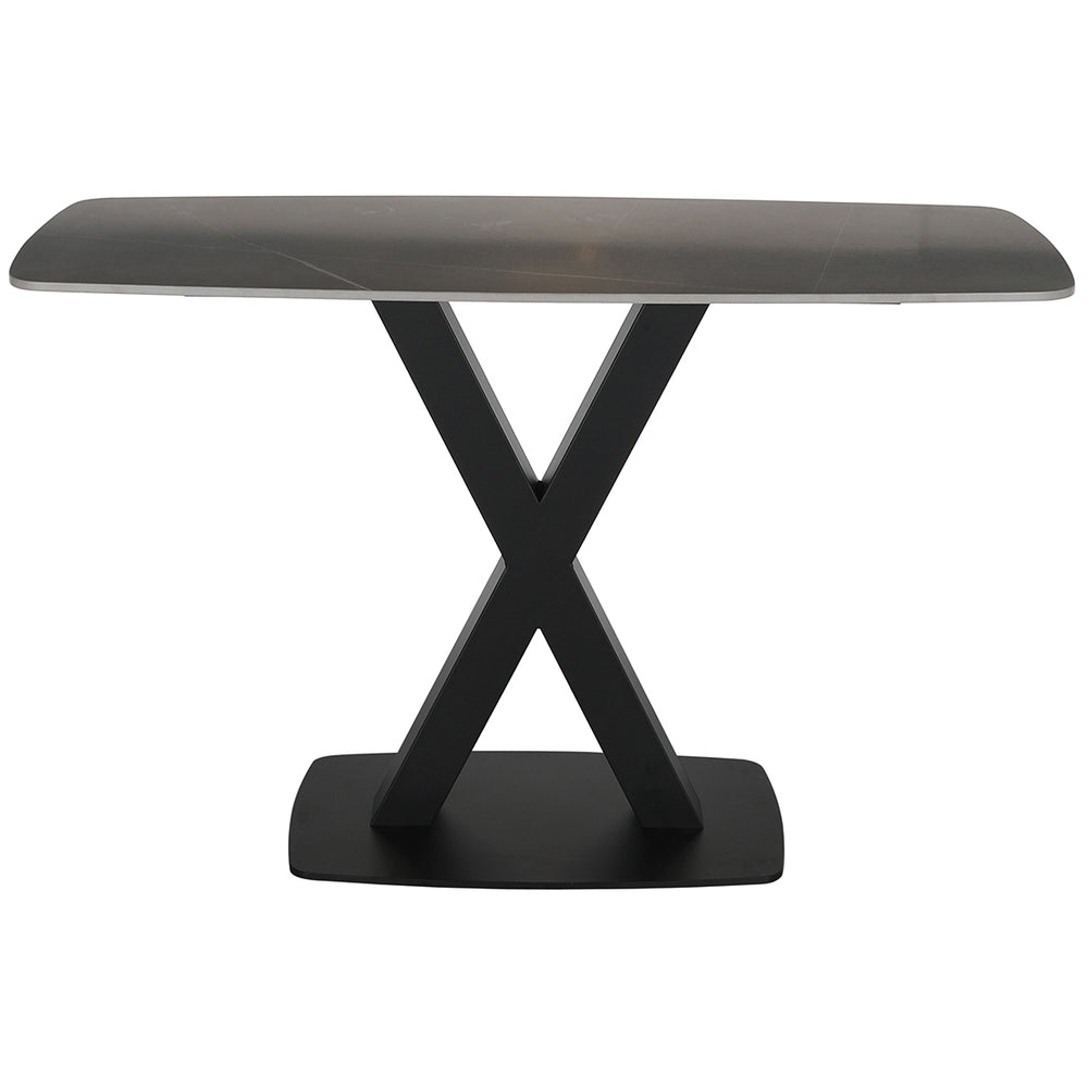 The table is supplied for partial assembly only — the sintered stone top is attached to the pedestal and base — making final installation quick. With its weatherproof and waterproof properties, this console is versatile for indoor use and sheltered outdoor or transitional spaces.