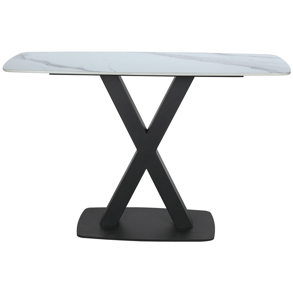 The Hartford White Stone Console Table brings contemporary style to narrow hallways, entries or living spaces. Its slim 120 cm-wide top in white sintered stone sits on a striking black powder-coated metal cross pedestal, offering a strong visual centrepiece without bulk.