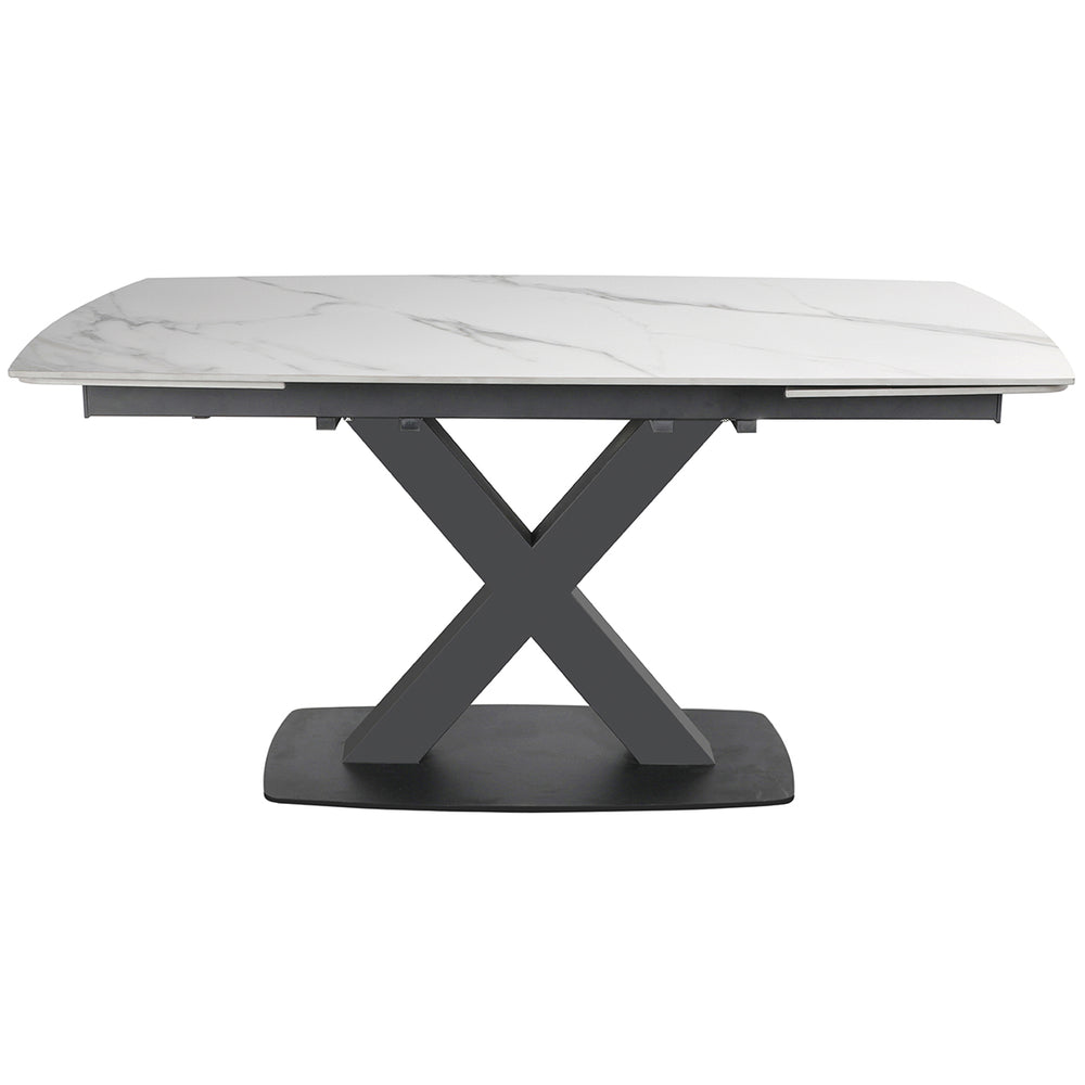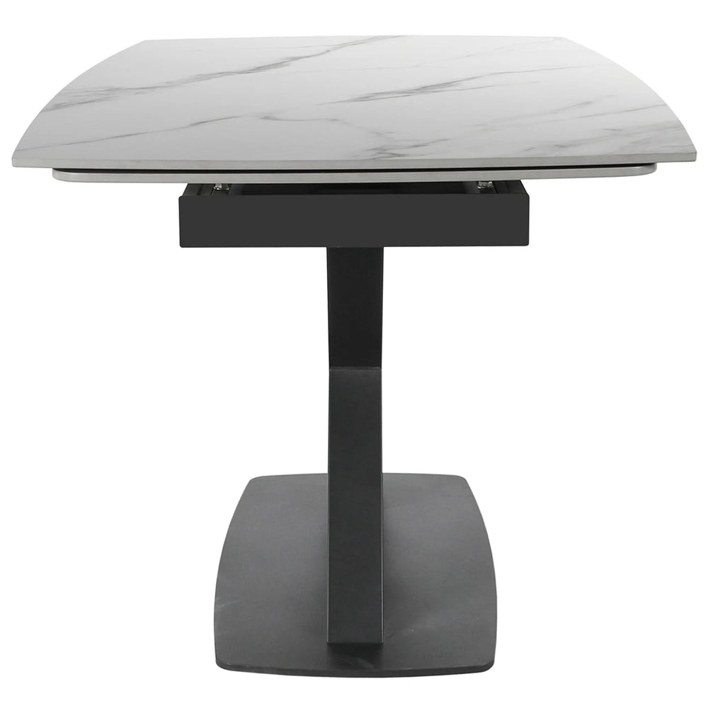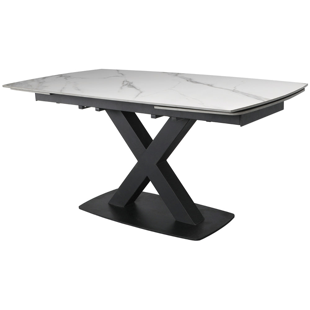 The Hartford extending dining table pairs a hard‑wearing white sintered stone top with a striking black powder‑coated metal pedestal base. The contemporary cross‑design pedestal offers a strong, stable support while keeping the seating area free from obstructive legs. The sintered stone top is food safe, hygienic and designed to resist daily wear.