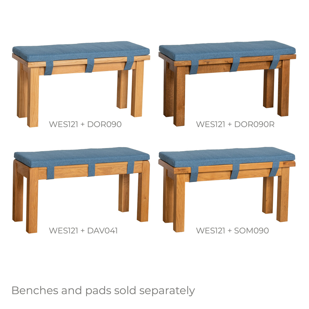 The Westbury bench pad is a soft felt seat cushion designed specifically for 90 cm benches. Its slim padded profile adds comfortable seating to hard wooden benches while keeping a contemporary look that complements Dorset Oak, Dorset Rustic, Avon Oak and Somerset Oak 90 cm benches.