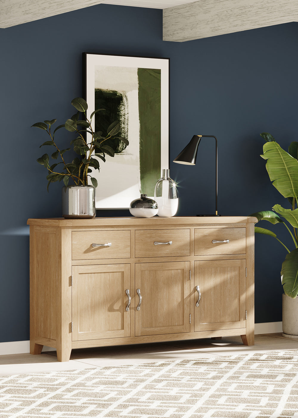 The construction balances the character of oak with practical engineered panels for stability. With no assembly required, the sideboard arrives ready to use and makes a substantial focal piece without the need for tools or fittings.