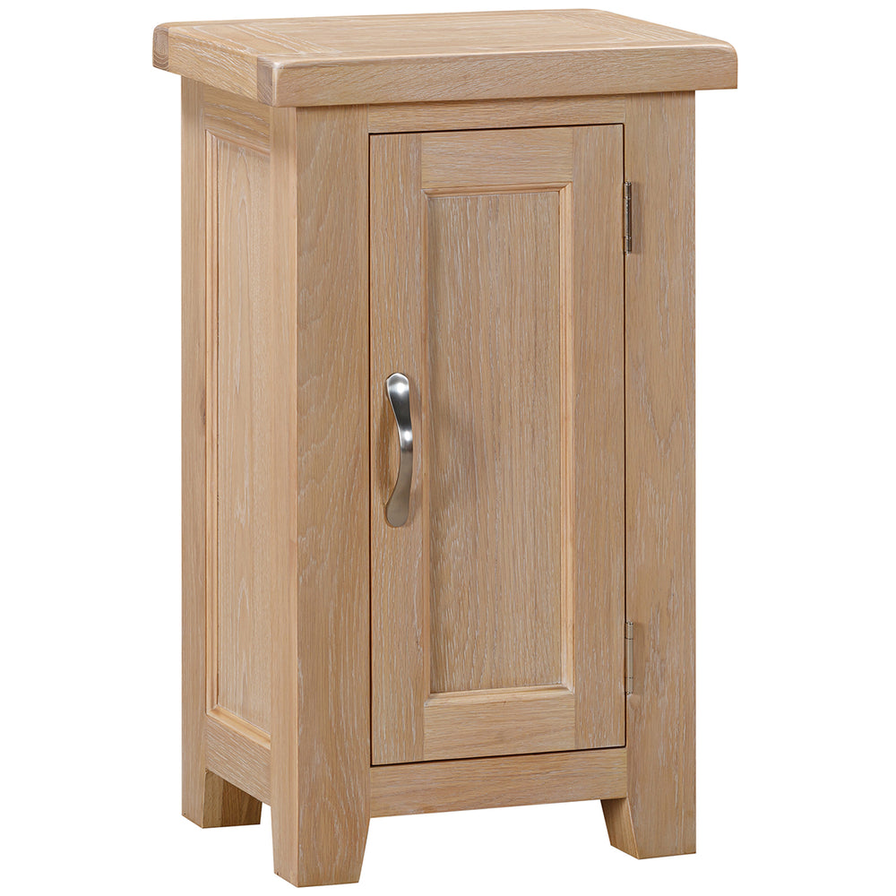 This Saxon oak one-door cabinet combines solid and engineered timbers with an oak veneer to create a compact, contemporary storage piece. The pale white-washed finish gives the wood a light, modern look while allowing the natural grain to show through subtly.
