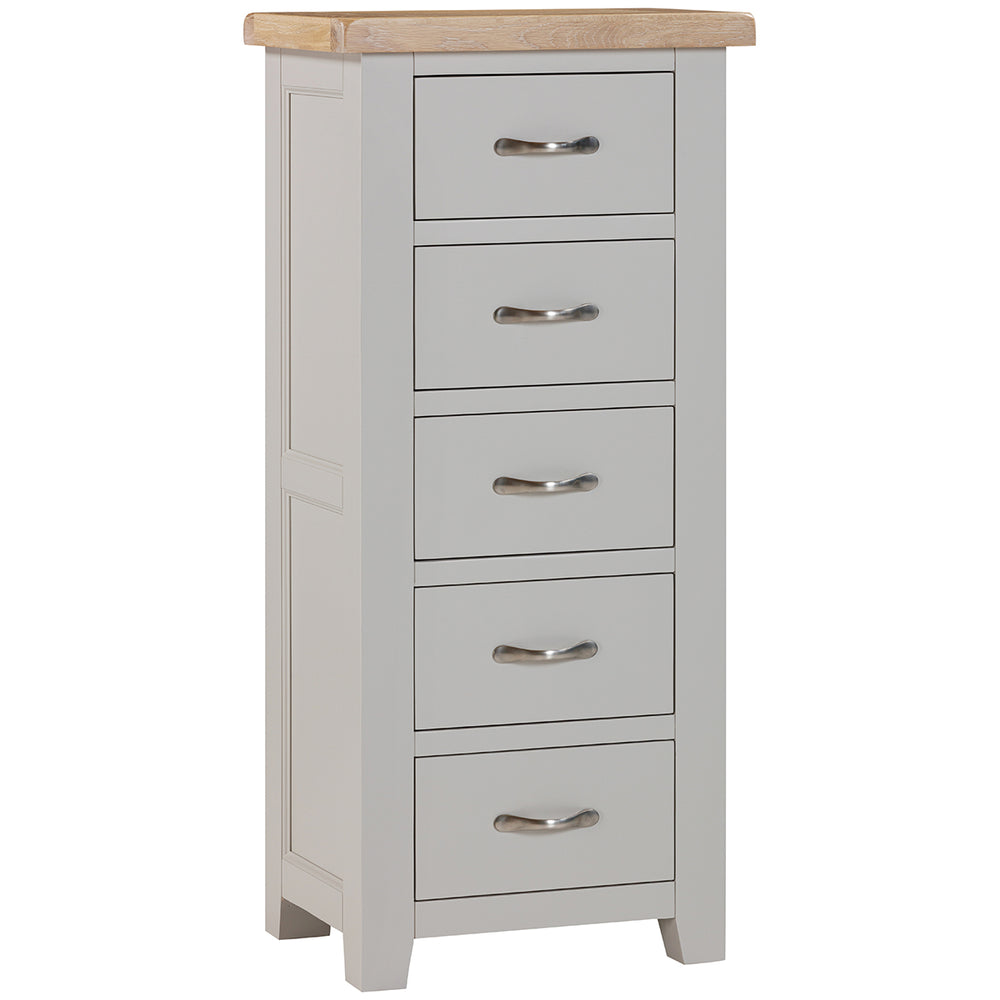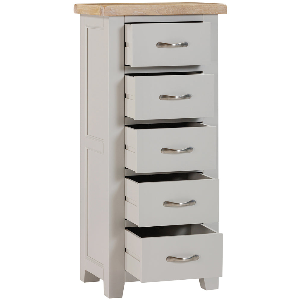 - Versatile storage — five graduated drawers give organised capacity in a narrow footprint suited to smaller rooms or halls.