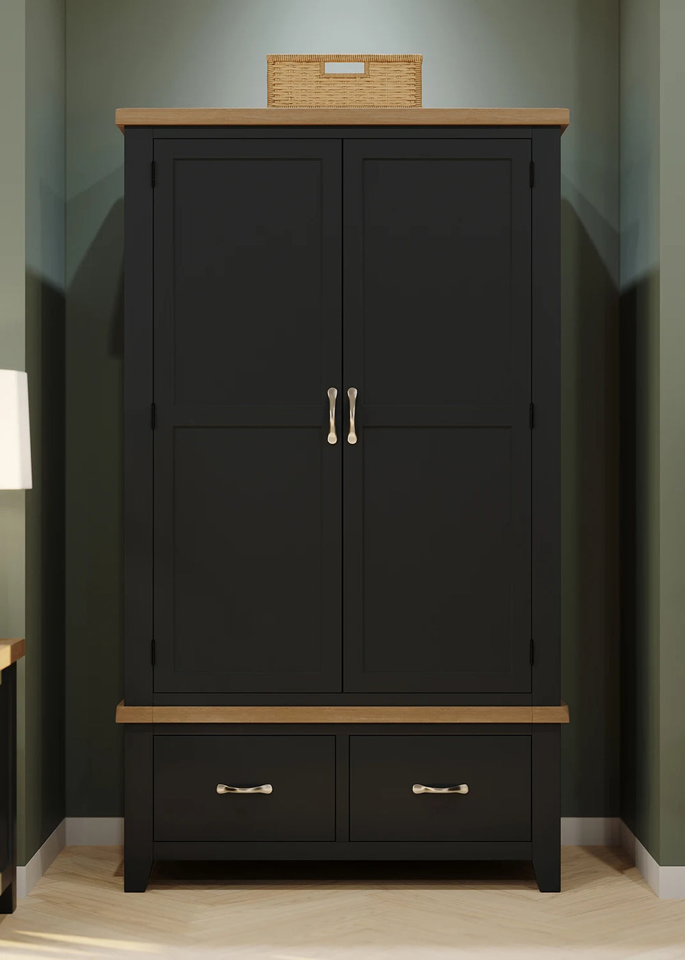 Built from a mix of oak, oak veneer, MDF and pine, the wardrobe is designed for everyday use. It features two dovetailed drawers with metal pull handles and a solid painted exterior that complements the pale oak top, offering a clean, modern look that’s easy to style.