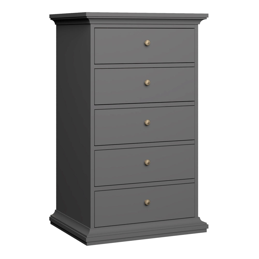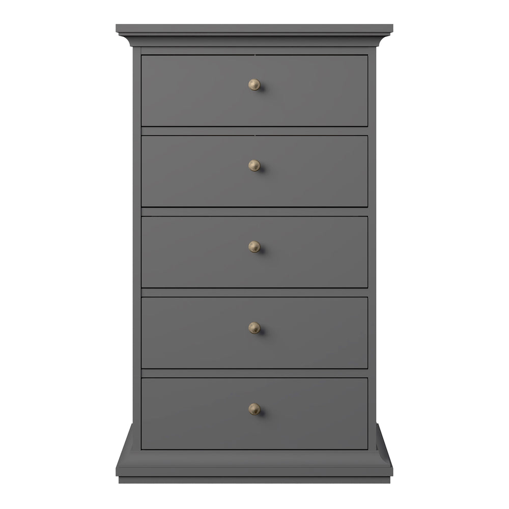 Paris Chest 5 Drawers in Grey is backordered and will ship as soon as it is back in stock.