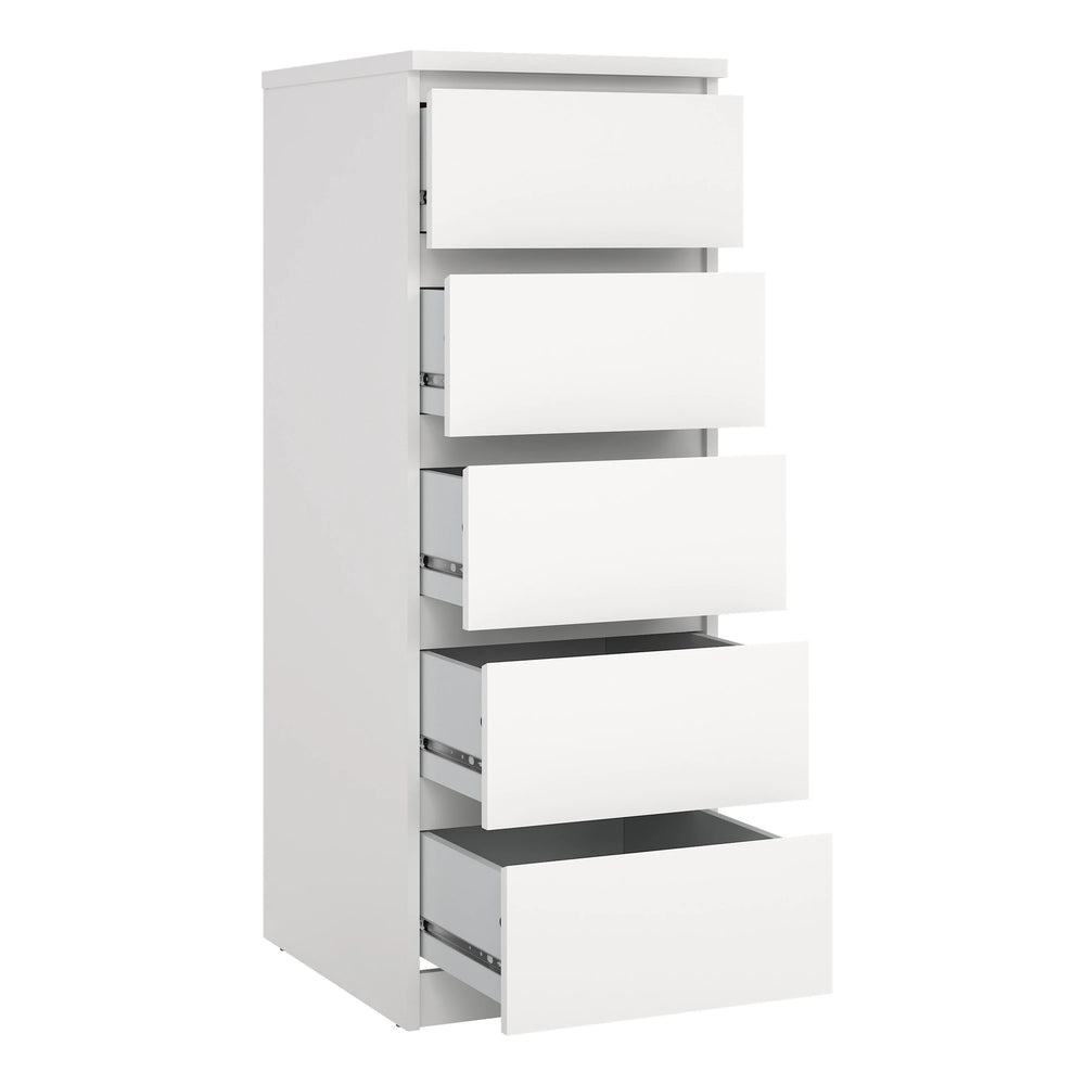Naia Narrow Chest of 5 Drawers in White is backordered and will ship as soon as it is back in stock.