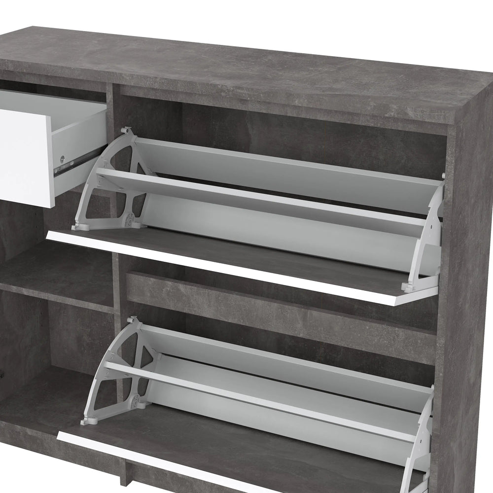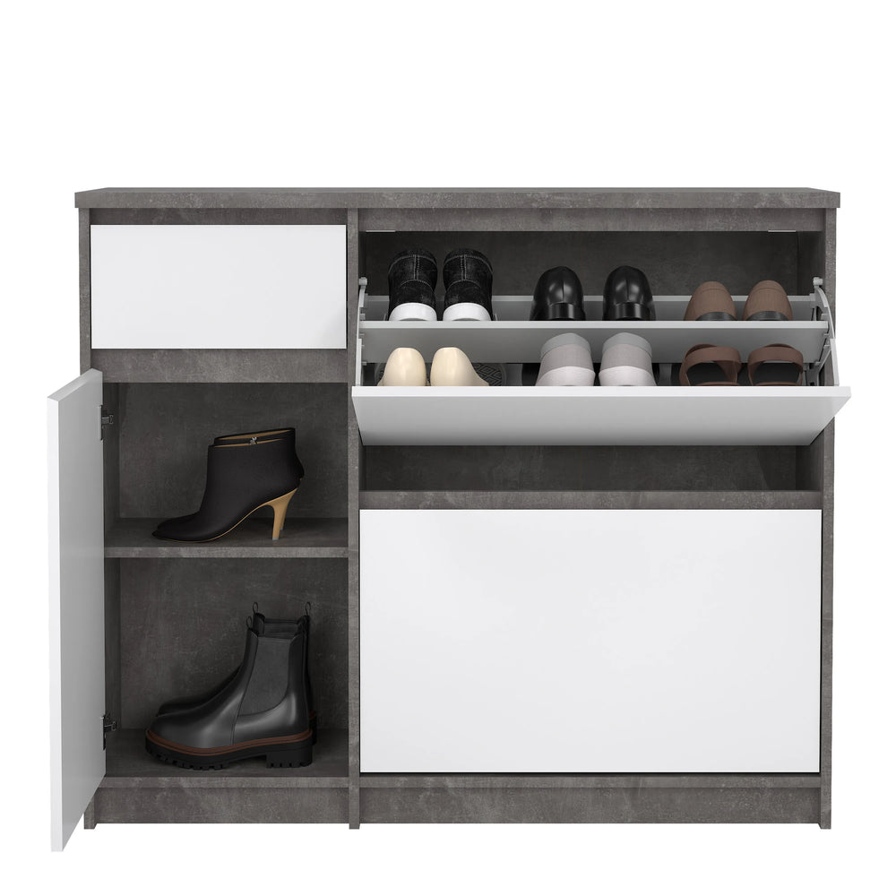 Naia Shoe Cabinet with 2 Flip Down Doors 1 Door and 1 Drawer in Concrete and White High Gloss