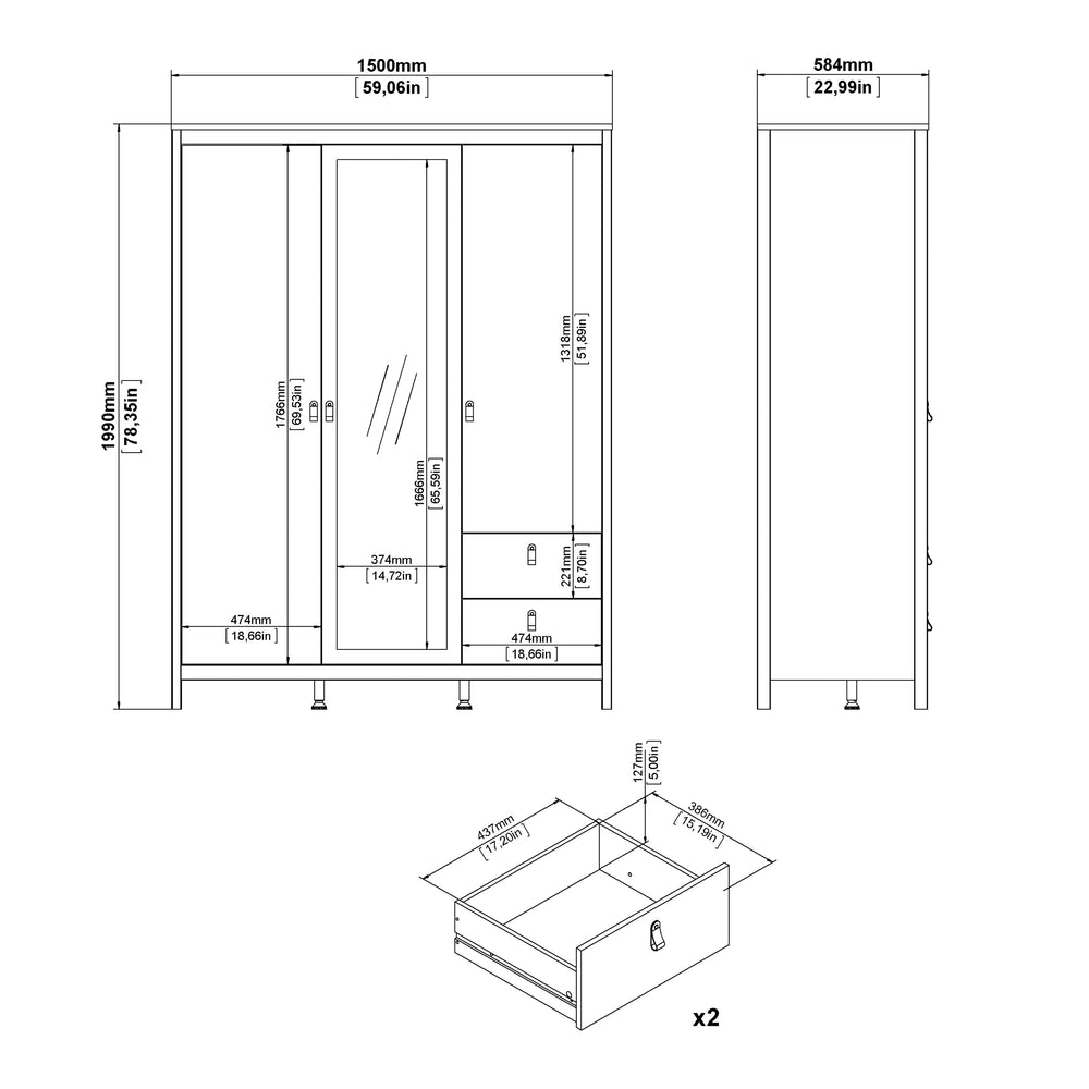 Barcelona Wardrobe with 2 Doors 1 Mirror Door 2 Drawers in Matt Black