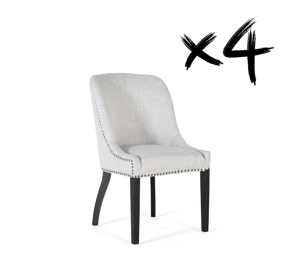 These contemporary chairs feature light grey fabric upholstery paired with natural black wooden legs and protective pads to safeguard your floors. With a leg height of 37 cm, a backrest height of 50 cm, and a seat size of 43 46 cm, overall dimensions measure 56 cm (W) x 62 cm (D) x 93 cm (H).