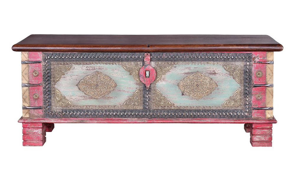 Keep extra linens or seasonal items within easy reach inside this chest, featuring mango wood construction and tasteful bronze details. A hinged lid streamlines access.