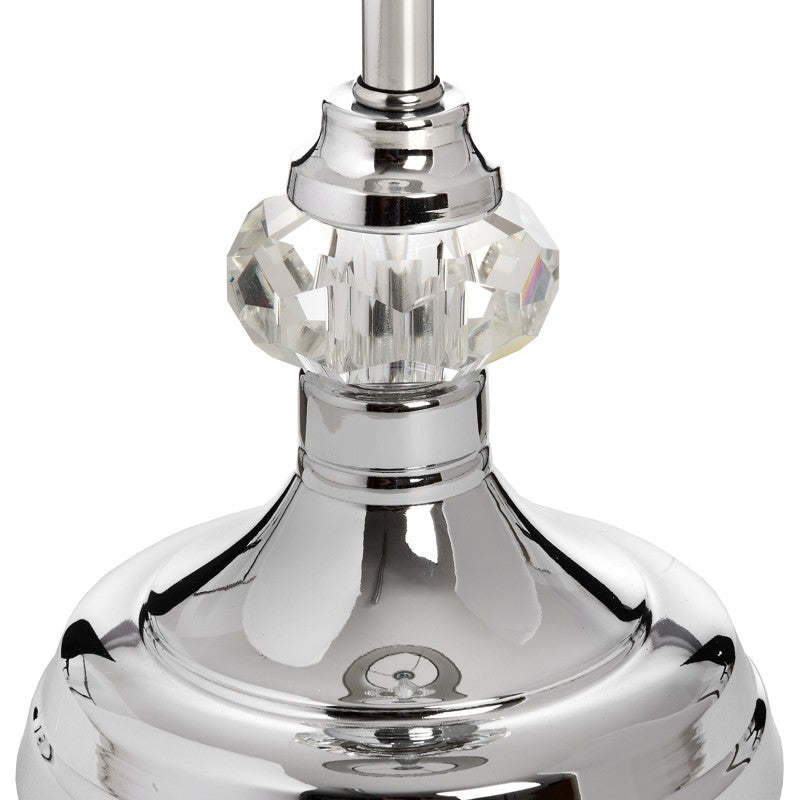 Experience the perfect blend of modern style and classic design with this exceptional table lamp. The sleek chrome base features a meticulously crafted glass accent that catches and reflects light with mesmerizing brilliance. The thoughtfully chosen grey and white herringbone shade adds textural interest while diffusing light beautifully throughout your space. This lamp exemplifies understated luxury that will appeal to discerning customers seeking quality lighting solutions. For a coordinated display that maximizes visual impact, we recommend pairing with our Silver Quarterfoil Decorative Hanging Mirror to amplify the reflective elements, the Antique Grey Large Ceramic Pear for textural contrast, and the Silver Heart Skeleton Wall Clock to echo the metallic finish. This carefully curated combination creates a cohesive aesthetic that your customers will appreciate for its attention to detail and enduring appeal.