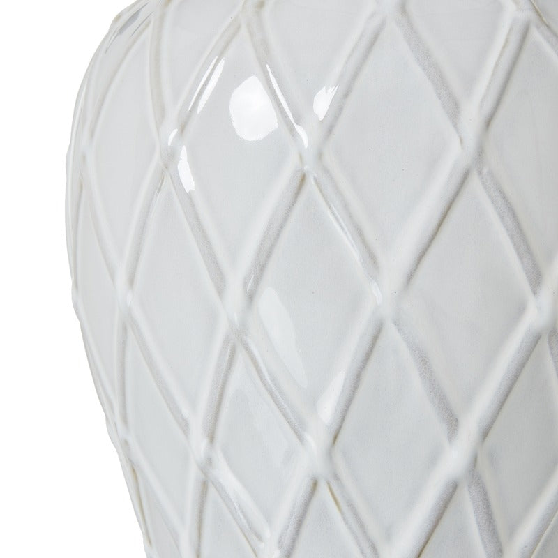 The White Ceramic Ginger Jar Lamp boasts a sophisticated and refined design. Its pristine white ceramic base features a subtly textured diamond pattern, adding depth and visual interest without overwhelming the clean, classic silhouette. This intricate detailing elevates the lamp from simple to stunning, creating a piece that's both elegant and eye-catching. Crowned with a crisp linen shade, this lamp seamlessly blends traditional form with contemporary appeal. Its versatile style makes it an ideal addition to various interior designs, from modern minimalist to transitional or even updated traditional spaces. Retailers will find this lamp to be a valuable inventory item, appealing to customers seeking to add a touch of understated luxury to their homes. It's perfect for brightening bedside tables, accenting console tables, or creating ambiance in living areas. Pair this lamp with natural textures, metallic accents, or rich, jewel-toned accessories to create striking visual contrasts. Its adaptable design allows it to complement a wide range of decor styles, making it a smart choice for diverse customer bases. This White Ceramic Ginger Jar Lamp offers timeless elegance and versatile styling potential, promising to be a popular choice among discerning homeowners and interior design enthusiasts alike.