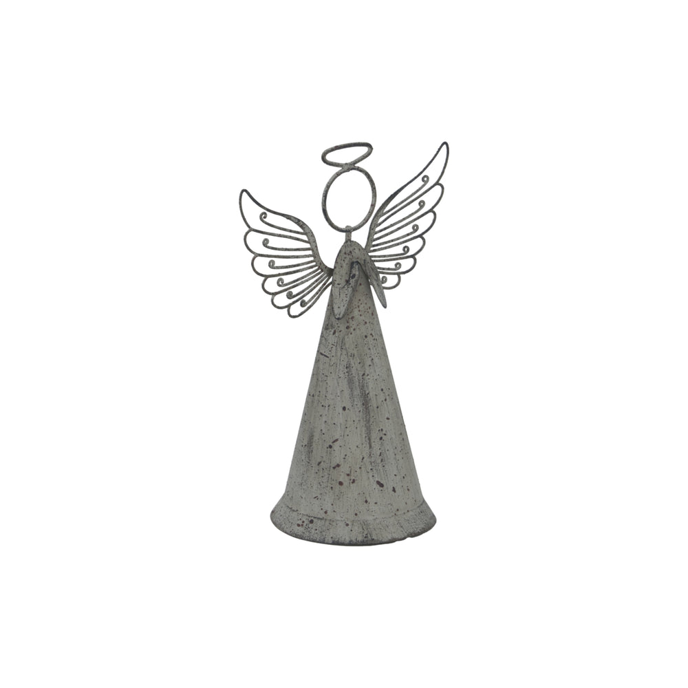 This ethereal metal angel combines rustic charm with celestial grace, offering retailers a distinctive decorative piece that resonates with customers seeking authentic character in their home dcor. The thoughtfully weathered metalwork creates an atmosphere of vintage allure, while maintaining a contemporary appeal that speaks to modern design sensibilities. The angel's stance suggests quiet contemplation, making it an ideal accent piece for both traditional and modern interior settings. Its modest proportions allow for versatile placement, from mantlepieces to shelving arrangements, while the detailed metalwork catches and reflects light in captivating ways. For optimal merchandising impact, consider pairing this piece with complementary metallic accessories such as antiqued brass candlesticks, weathered metal wall crosses, or vintage-style wire mesh lanterns. The neutral metallic finish ensures seamless integration with various colour schemes and dcor styles, from farmhouse to industrial chic. Religious and spiritual symbolism combined with artistic merit makes this piece particularly appealing to customers seeking meaningful decorative elements. The angel's serene presence and careful attention to detail in the wing design and robing creates an immediate emotional connection, promising strong consumer appeal across different market segments.