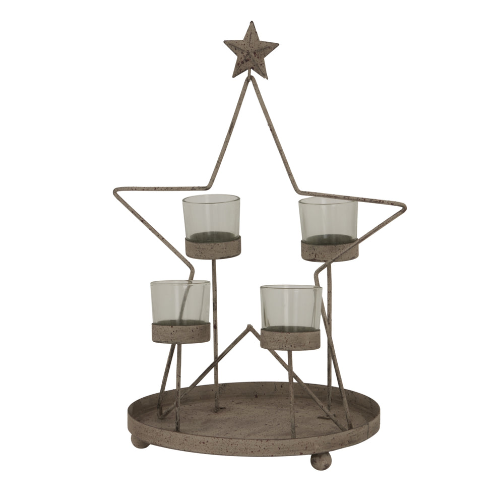 A centrepiece that merges rustic appeal with contemporary design, this distinctive star-shaped candle display offers a mesmerising interplay of light and shadow. The weathered metal framework creates dramatic silhouettes against walls and ceilings, while four perfectly positioned glass votives nestle within the geometric star pattern. Each votive is expertly crafted to amplify the glow of LED candles, creating a safe yet atmospheric lighting solution ideal for both residential and commercial spaces. The industrial-meets-vintage aesthetic makes this piece particularly appealing for boutique hotels, restaurants, and design-conscious retail environments. When illuminated, the star motif casts enchanting patterns that dance across surrounding surfaces, creating an ambient atmosphere perfect for evening entertainment or seasonal displays. For maximum impact, consider pairing with metallic wall sconces, decorative lanterns, or coordinating pendant lights in similar aged finishes. The addition of mercury glass accessories, metallic orbs, or geometric tea light holders will enhance the overall aesthetic and create a cohesive collection for your customers. This versatile lighting feature works equally well as a table centrepiece or wall-mounted attraction, offering retailers multiple merchandising opportunities throughout the year.