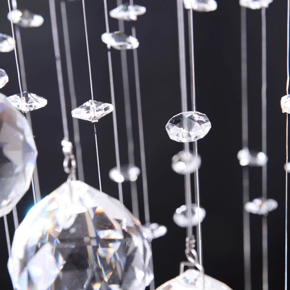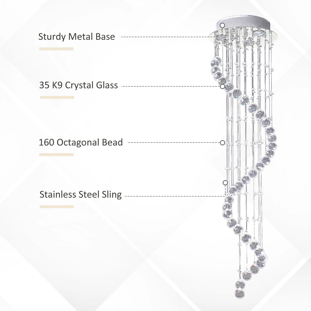- CRYSTAL & SHINING STYLE: This crystal spiral sphere raindrop ceiling light with polished chrome finish and numerous chains of clear glass faceted beads to create a romantic and lovely atmosphere. Those hang down crystal pendant added extra sparkling effect.