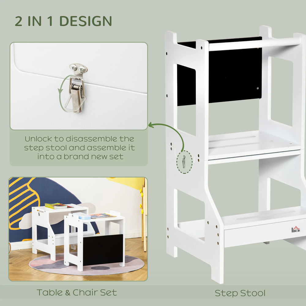 Introduce your child to a world of independence and creativity with the HOMCOM toddler kitchen stool. Designed for children aged 3 to 6, this multifunctional piece allows little ones to safely reach sinks and countertops, fostering participation in family activities like cooking and cleaning. With secure guardrails and handrails, parents can rest assured of their child's safety. Transforming into a desk and chair with a simple lock release, it offers a perfect spot for play, meals, and learning. The included chalkboard inspires artistic expression, making it an ideal choice for nurturing self-reliance and imagination.