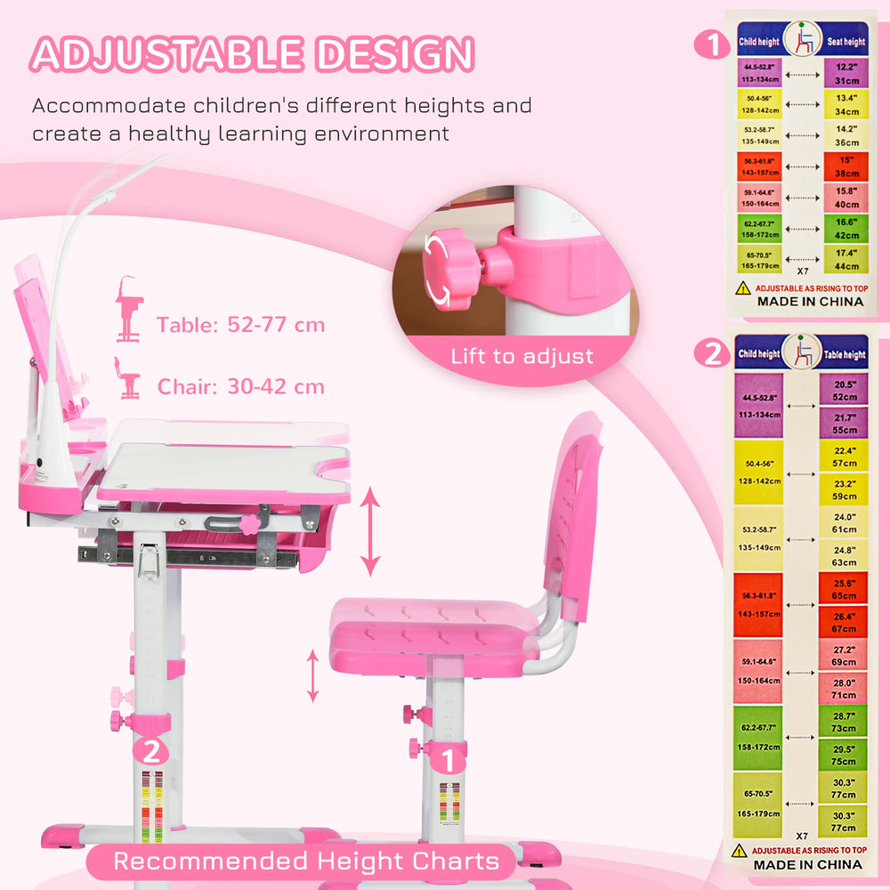 HOMCOM Kids Study Desk and Chair Set w/ Adjustable Height, Storage, Drawer, Pink