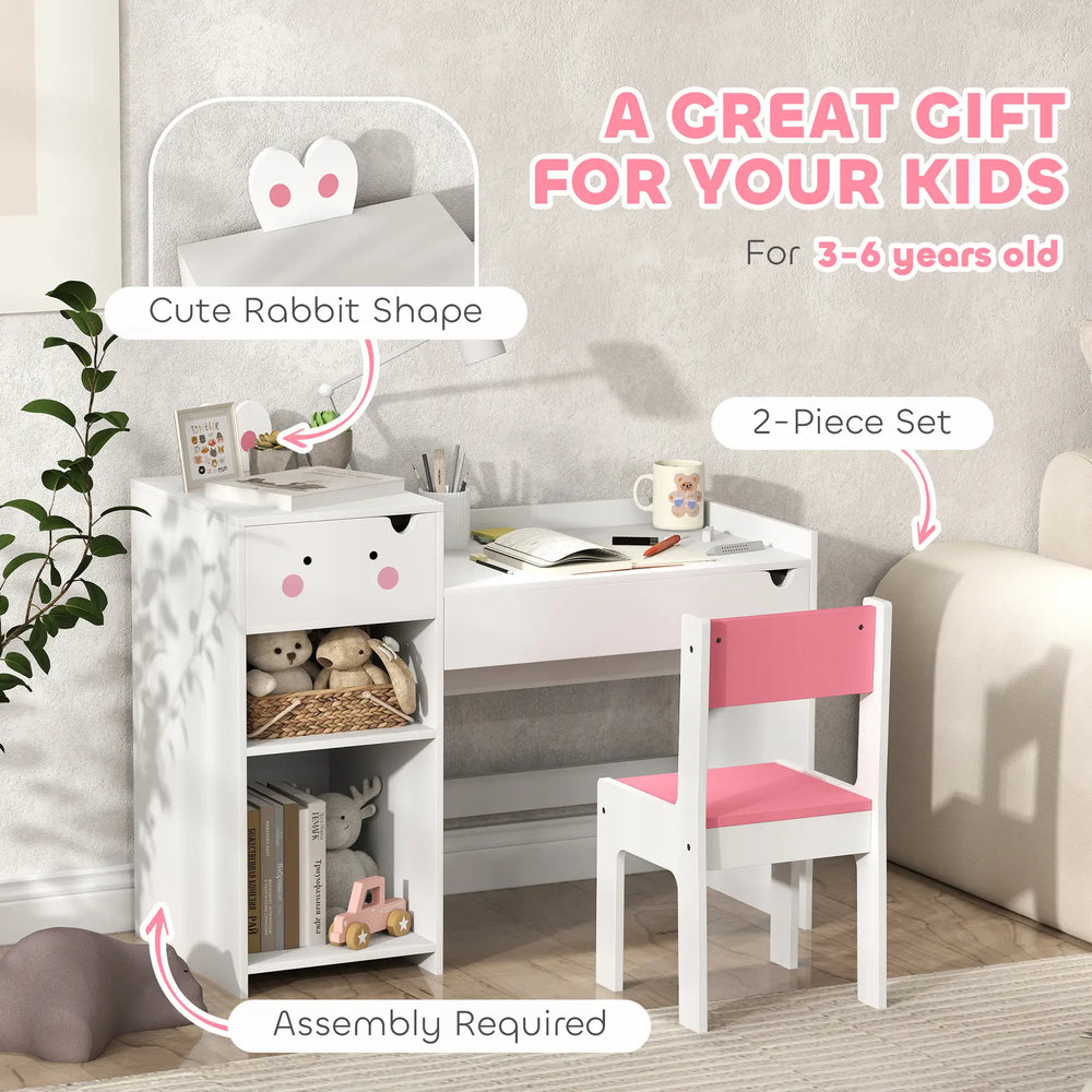 AIYAPLAY Rabbit-Themed Kids Desk and Chair Set with Bookcase, Drawers, Shelves, for Ages 3-6 Years, Whtie/Pink
